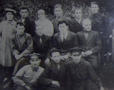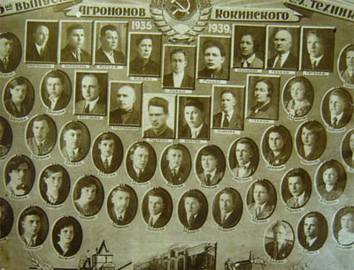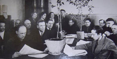Педагогический совет в 1935 году. Стоят слева направо: Новикова Л.А., Кузнецова А.М., Гениуш В.А., Новиков М.А., сидит у стены Креслин Я.К. (зав. учхозом), сидят за столом слева направо Серебрянников С.В., Гениуш Н.П., Титов В.М., Колесняк В.Я., Казанская Н.Г., Рылько П.Д., Куприн И.М., Новиков М.И., Троепольский А.А. |