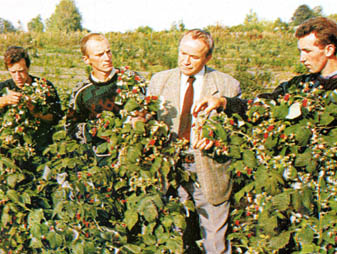 На этом стенде помещена фотография Казакова Ивана Васильевича – доктора наук, профессора, члена-корреспондента Российской академии сельскохозяйственных наук, Заслуженного деятеля науки Российской Федерации, выдающегося селекционера, кавалера Ордена Почета. 40 лет он проработал в Кокино. В начале сотрудником опорного пункта Всероссийского селекционно-технологического института садоводства и питомниководства, а с 1991 года возглавил этот опорный пункт. С момента основания Брянской госсельхозакадемии он возглавляет кафедру плодоводства. За 40 лет работы в Кокино он вывел более 20-ти высокопродуктивных и зимостойких сортов малины, которые составляют основу современного сортимента этой культуры в России. В Кокино создан крупнейший в мире гибридный фонд малины. Иван Васильевич – личность одаренная, эмоциональная, он пишет прекрасные стихи, знает наизусть почти всего Сергея Есенина. | ||