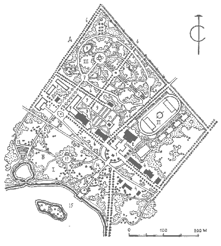 7 - новая главная аллея 8 - альпинарий (каменный сад) 9 - сирингарий 10 - розарий 11 - опытный участок цветоводства 12 - летняя эстрада 13 - танцевальная площадка 14 - спуск к озеру 15 - озеро | |