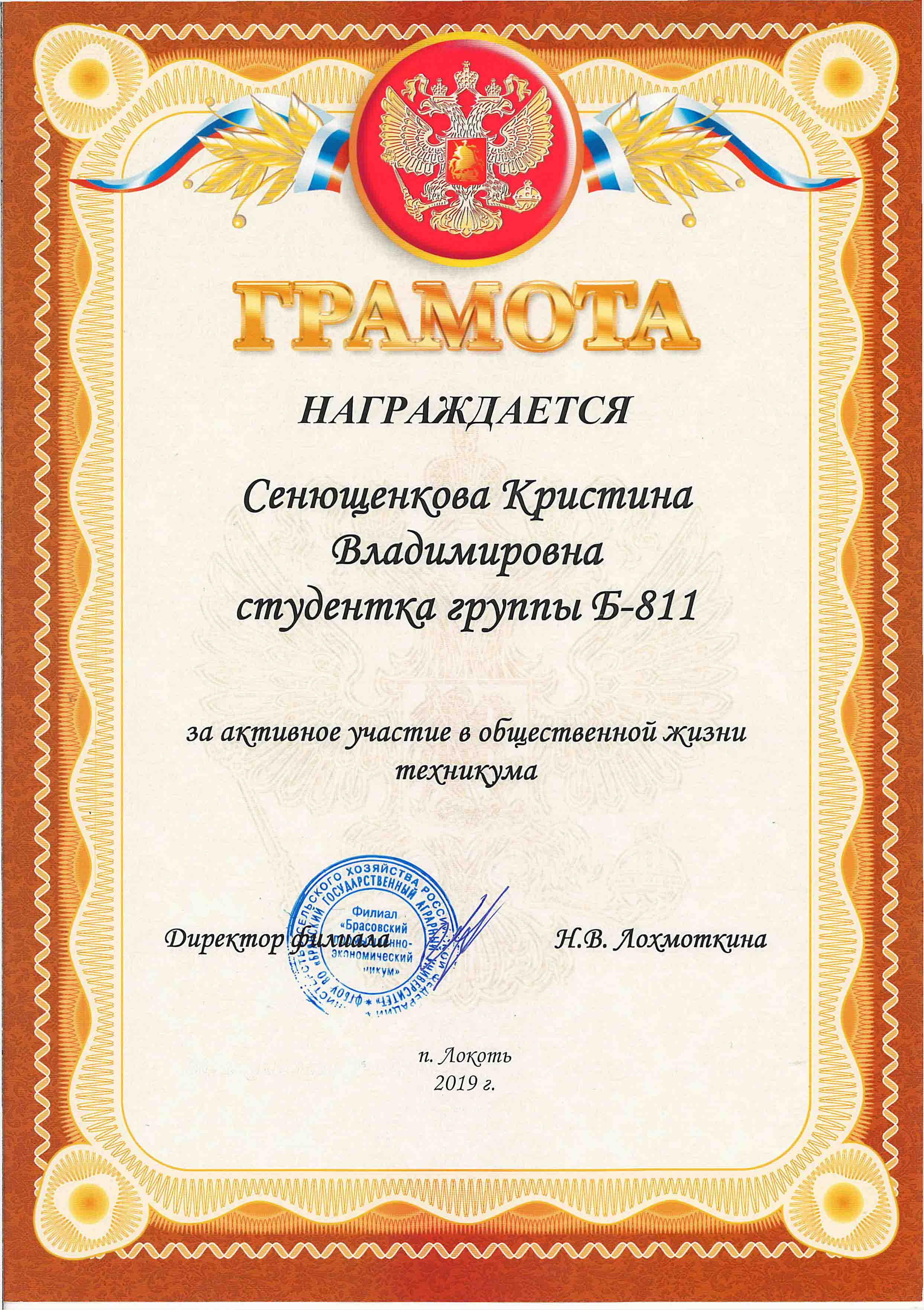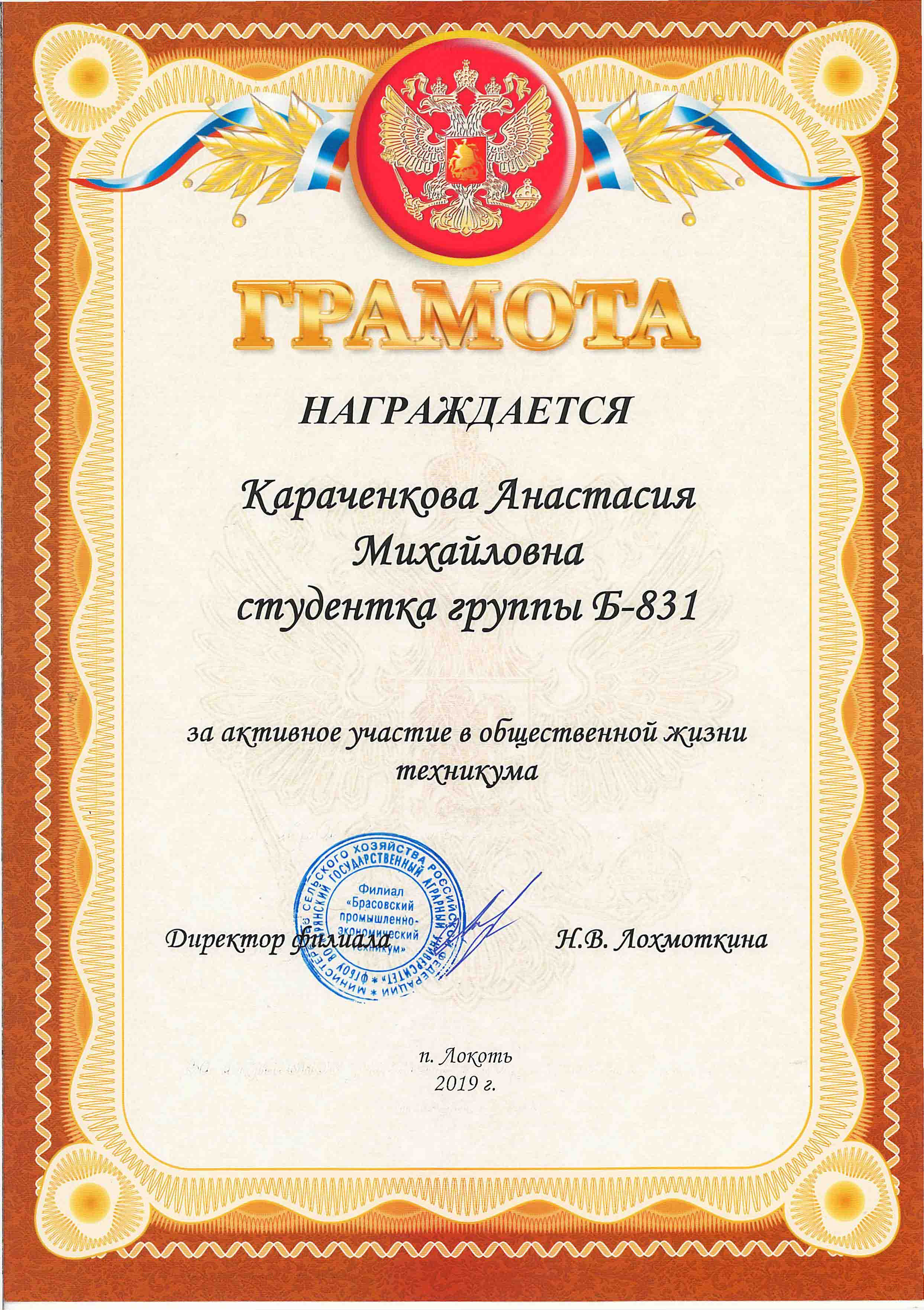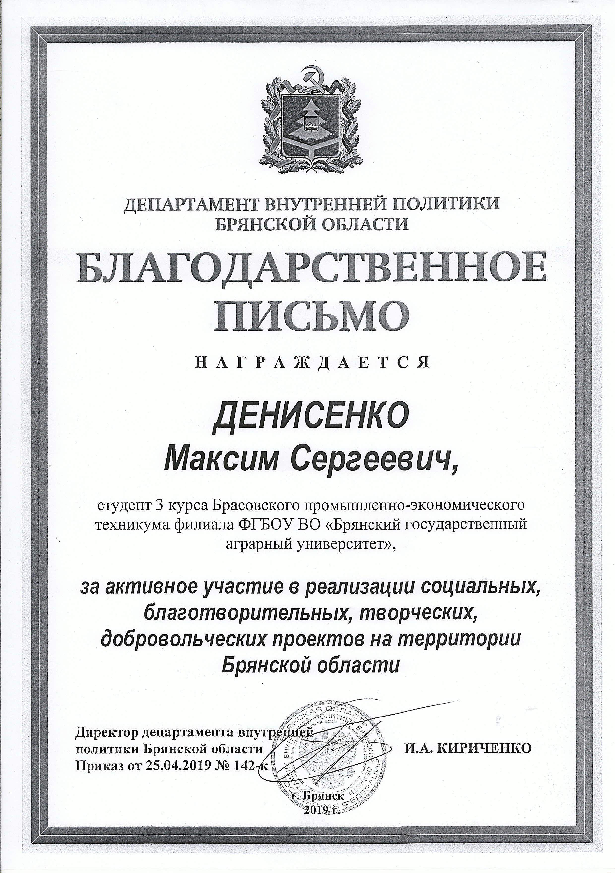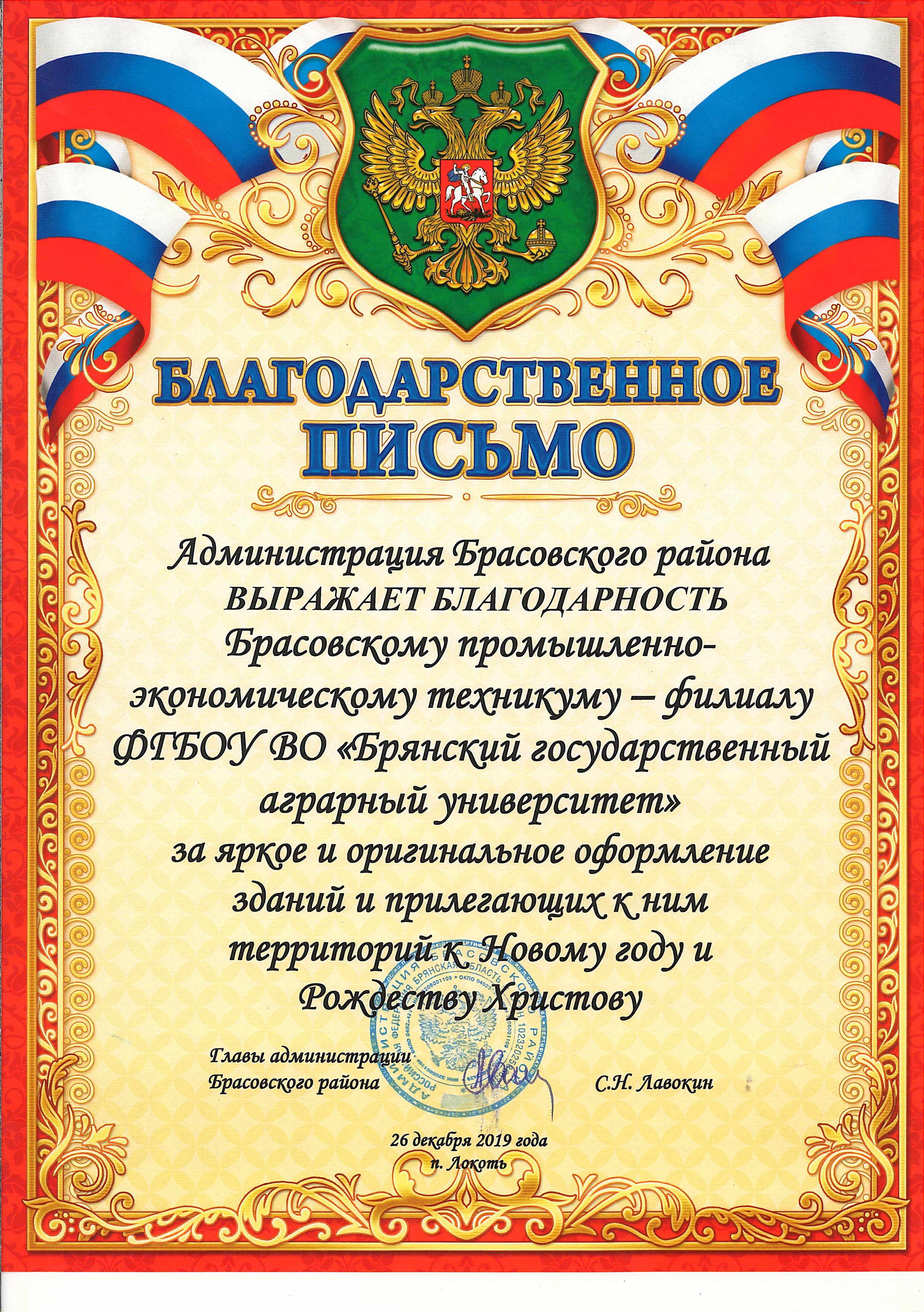 БЛАГОДАРСТВЕННОЕ ПИСЬМО АДМИНИСТРАЦИИ БРАСОВСКОГО РАЙОНА
