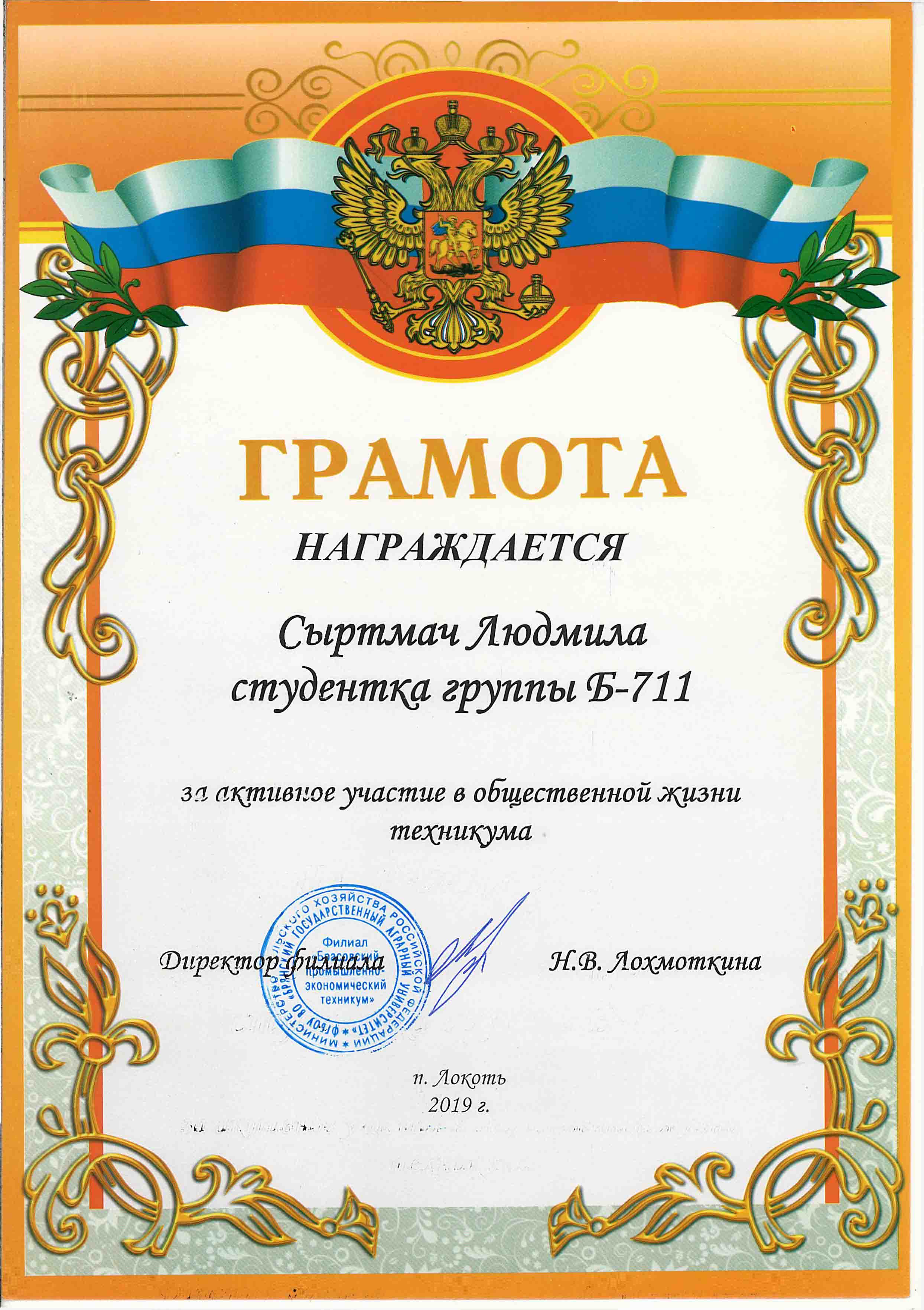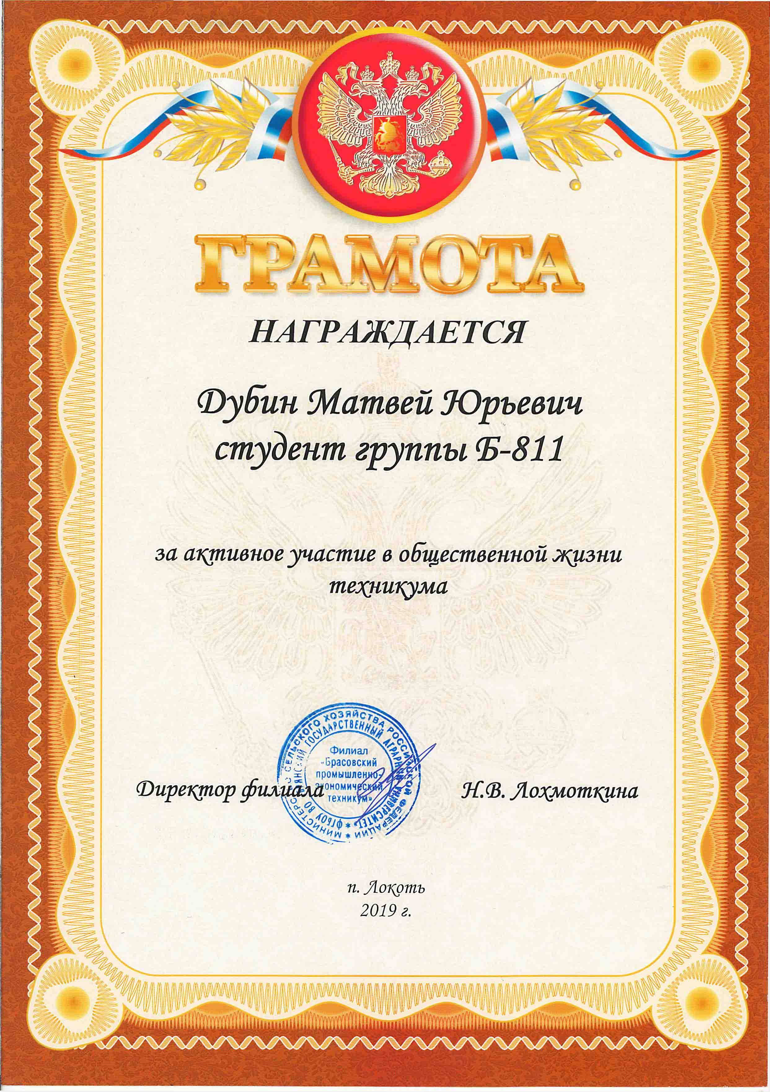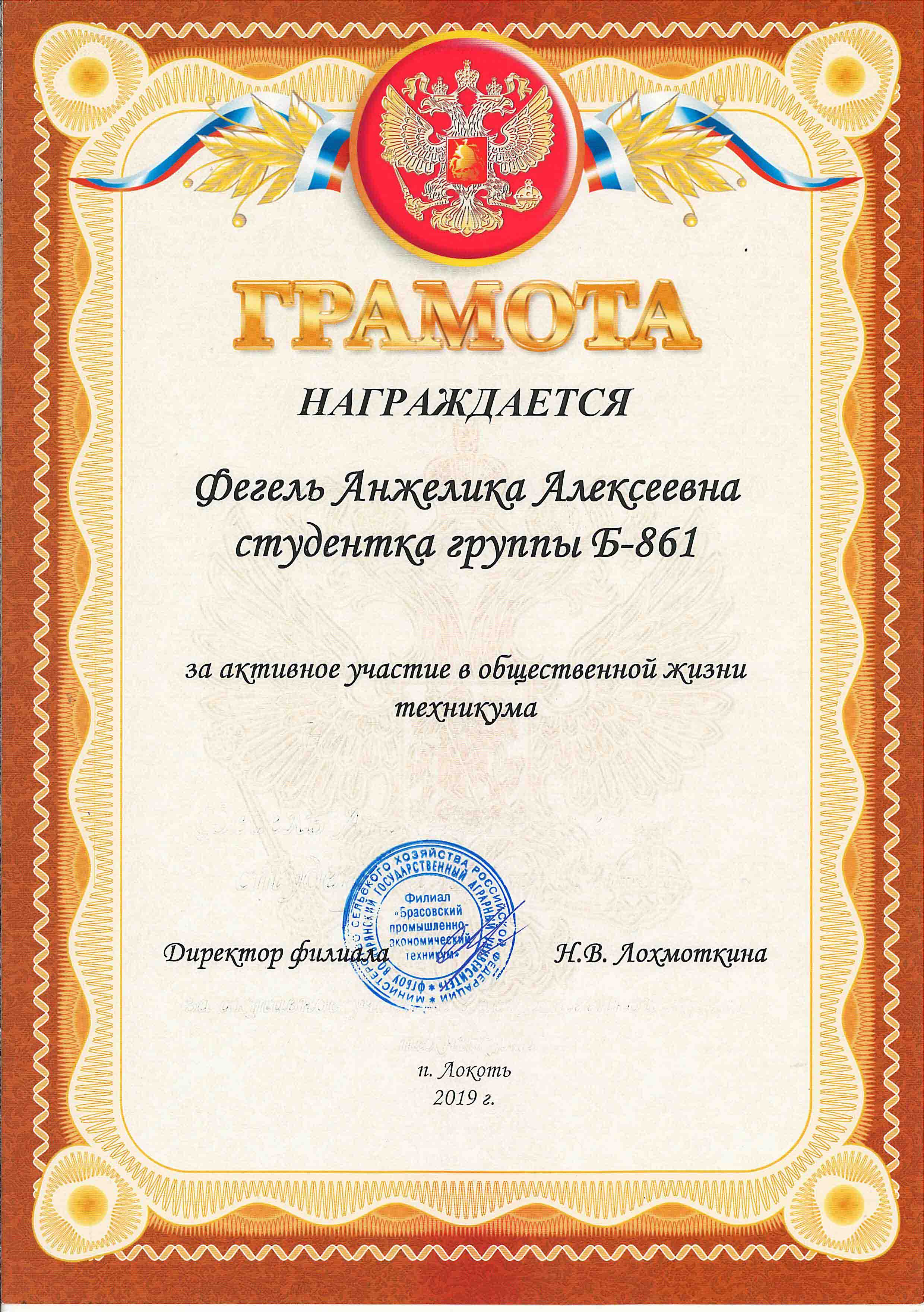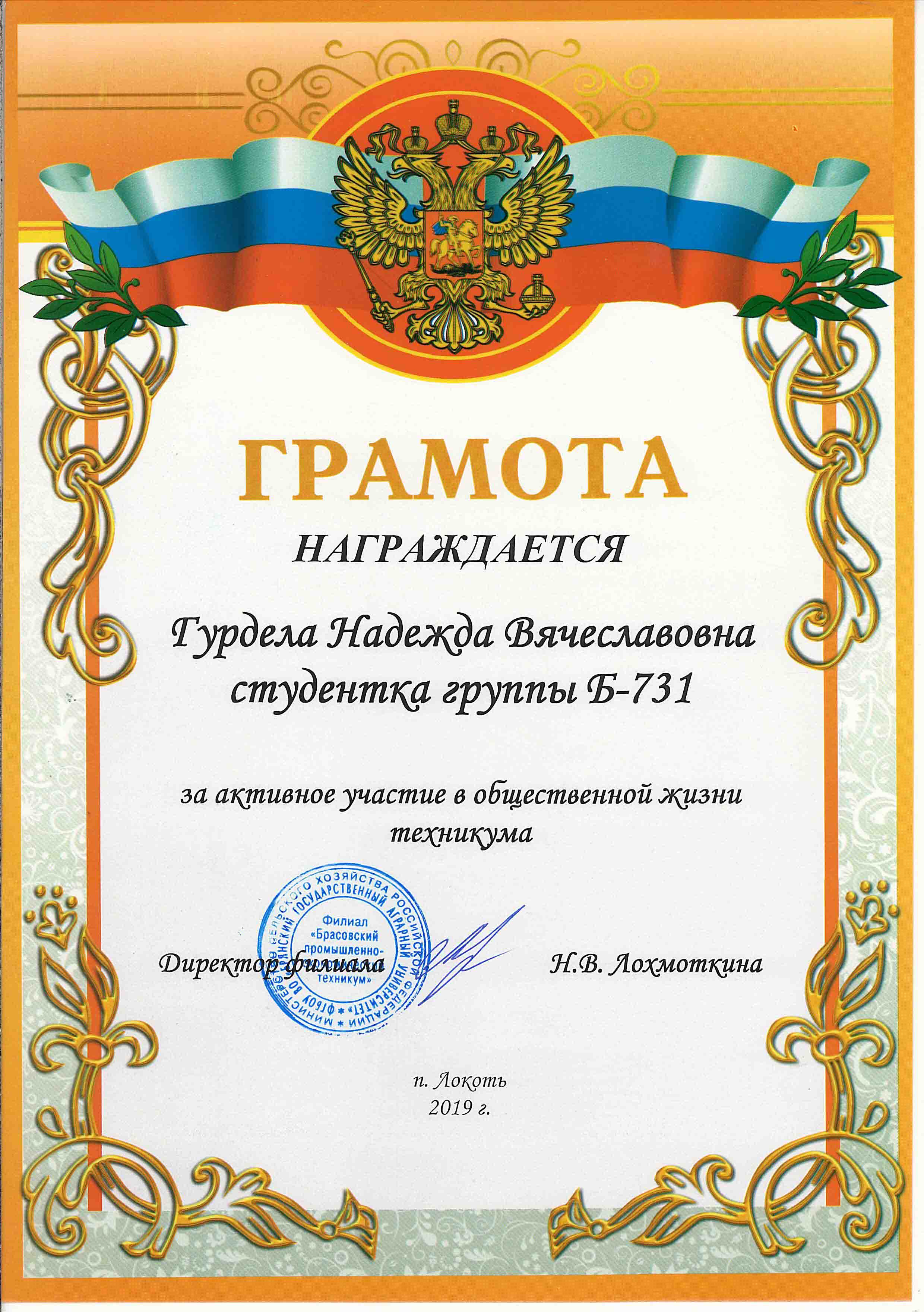 ЗА АКТИВНОЕ УЧАСТИЕ В ОБЩЕСТВЕННОЙ ЖИЗНИ ТЕХНИКУМА