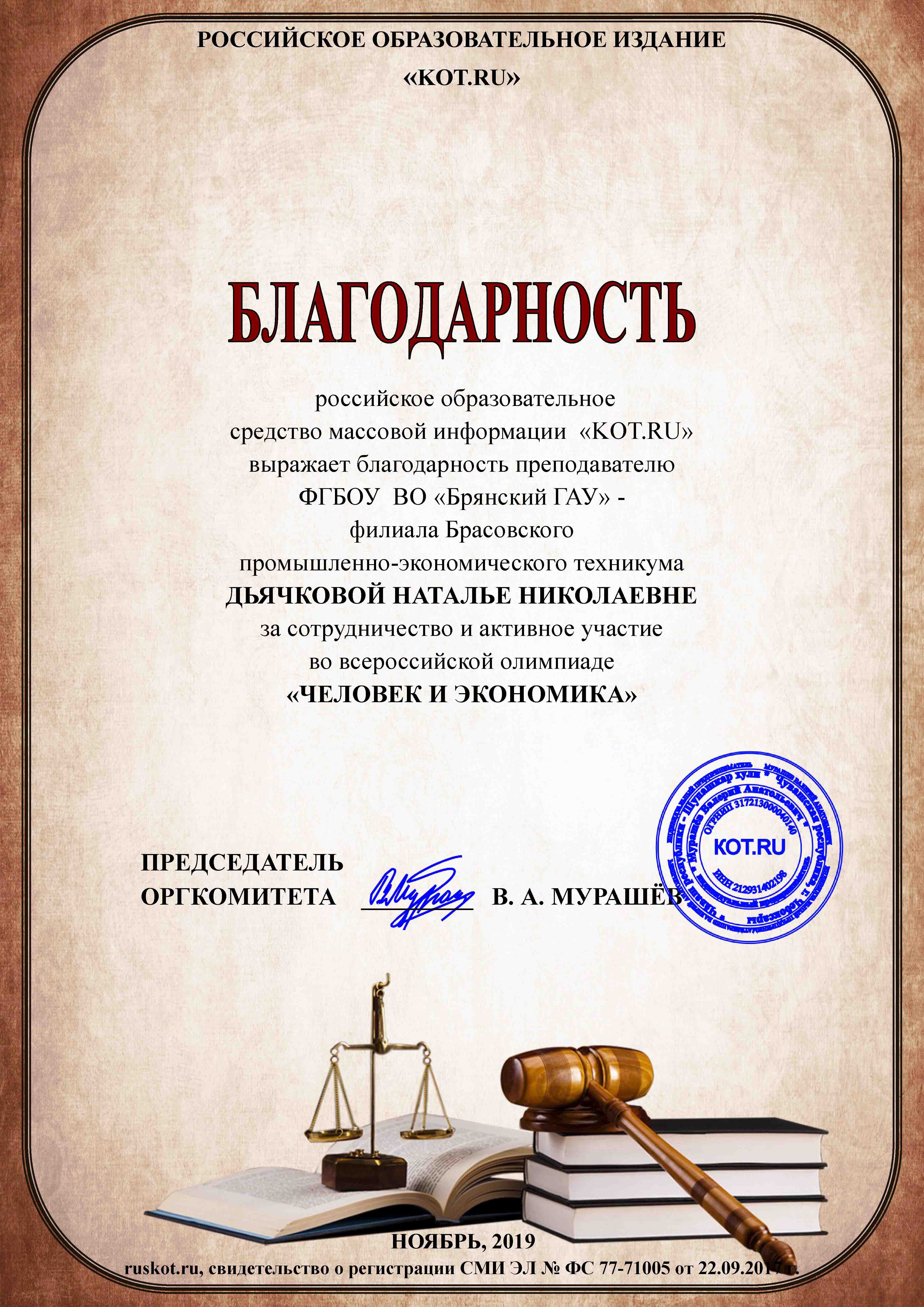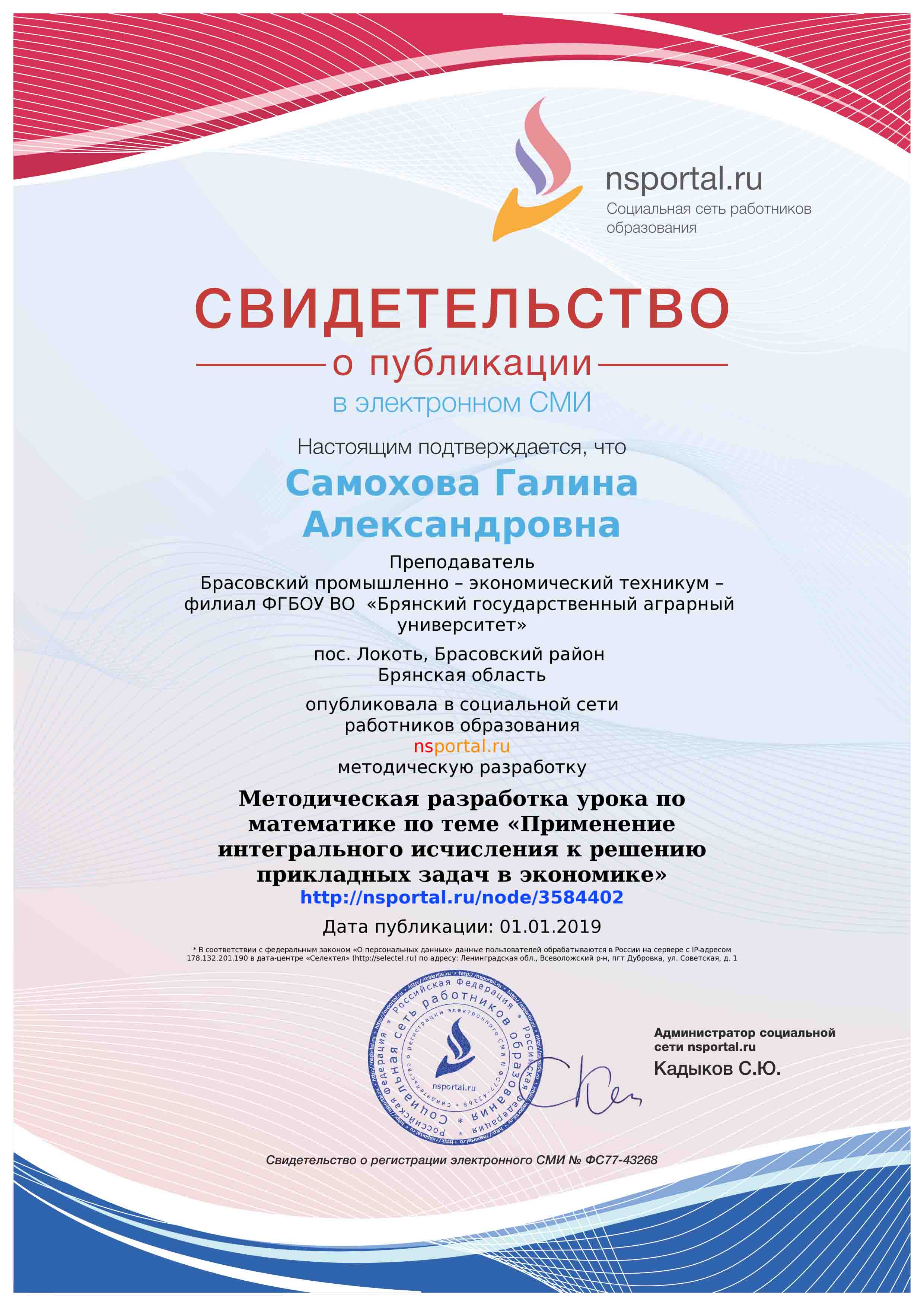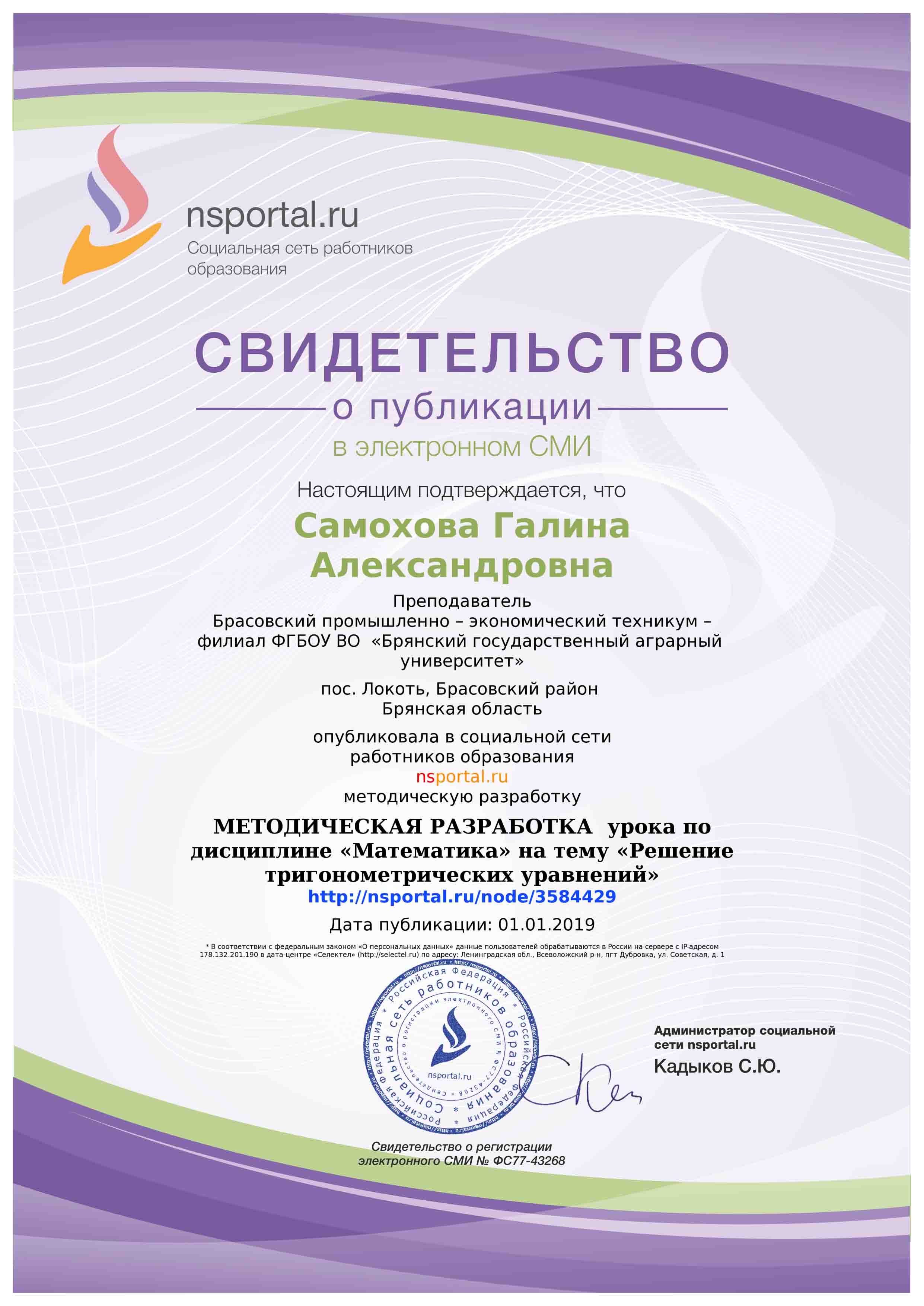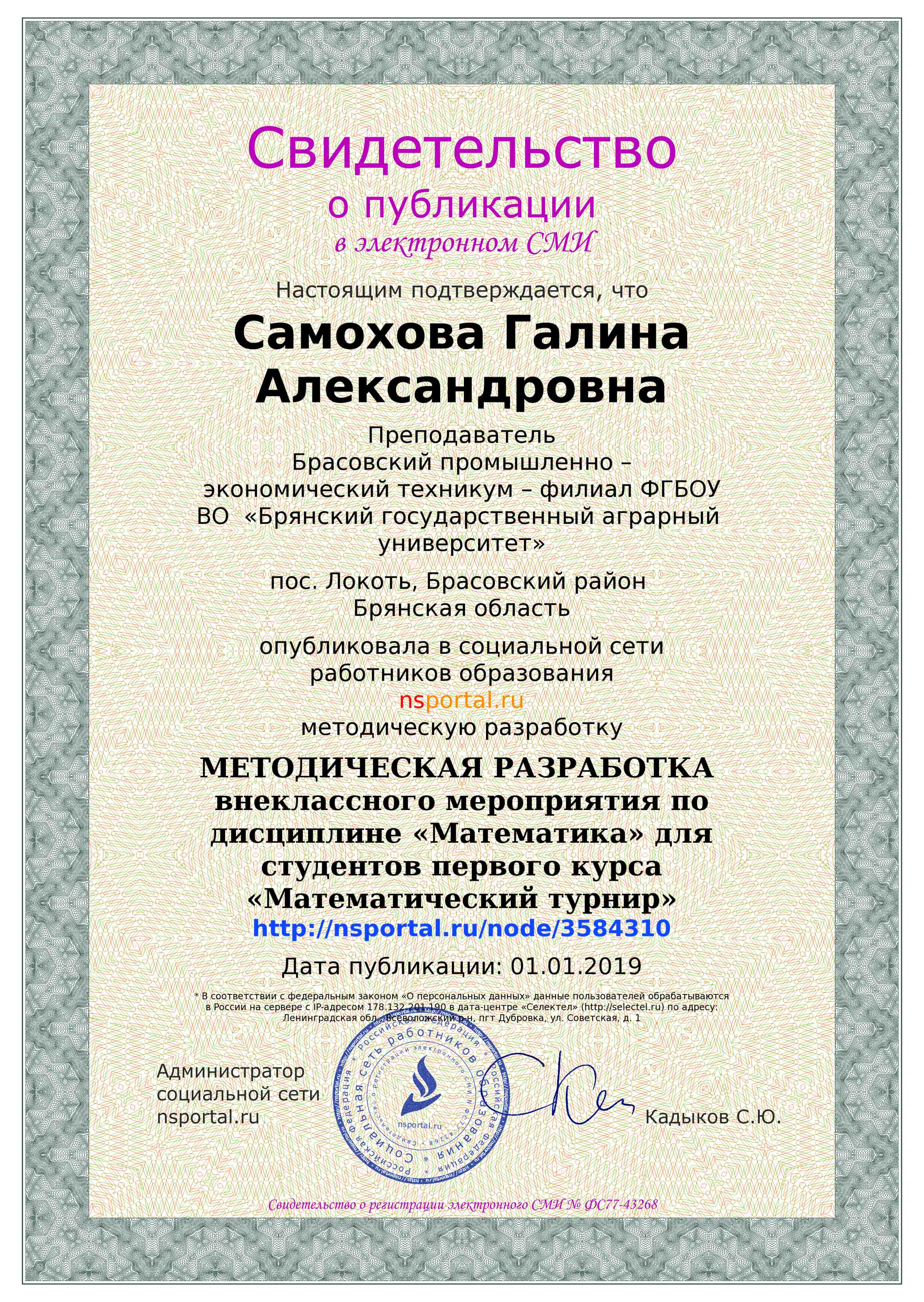 СВИДЕТЕЛЬСТВО О ПУБЛИКАЦИИ В СМИ "ИНФОРМИО"