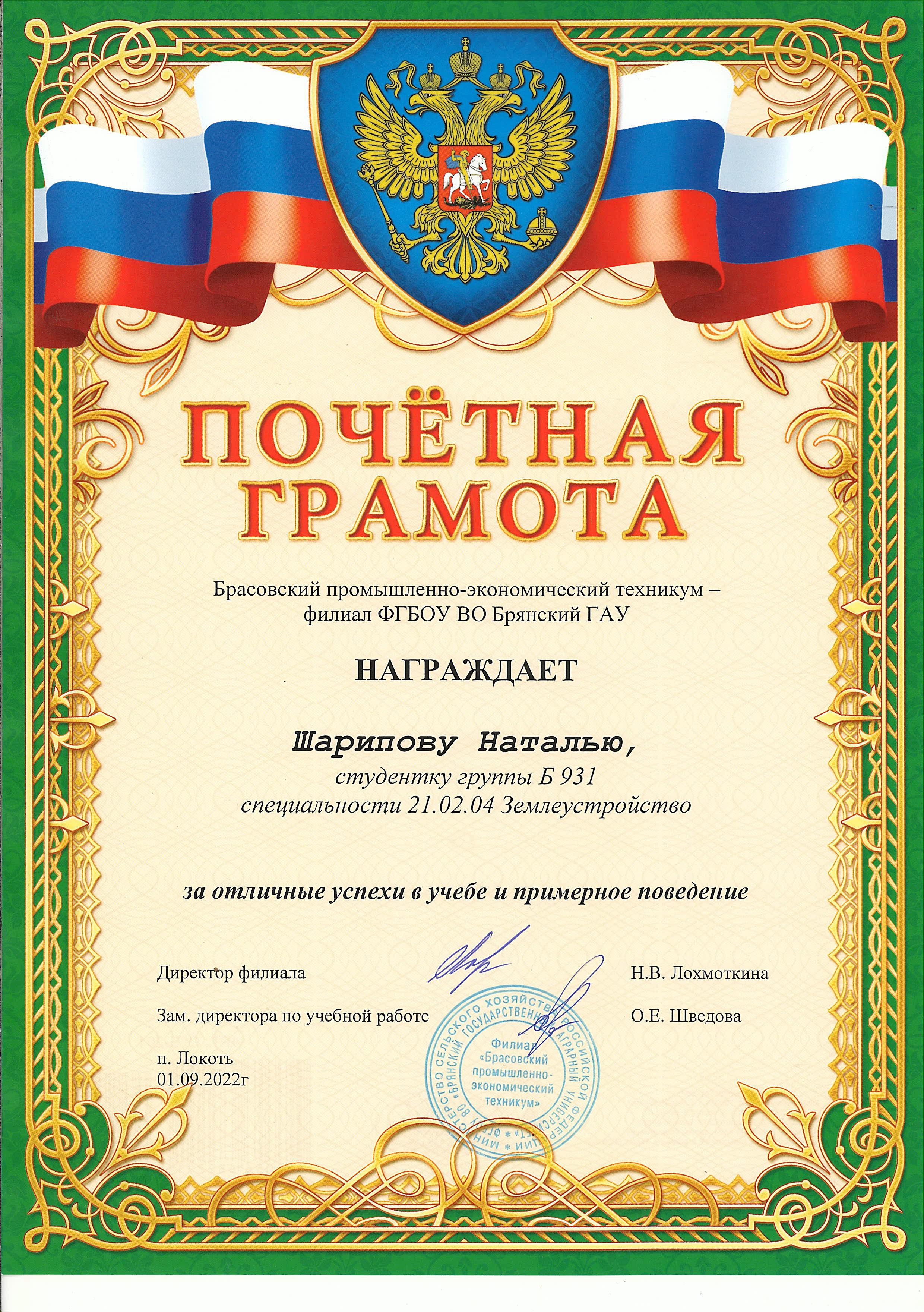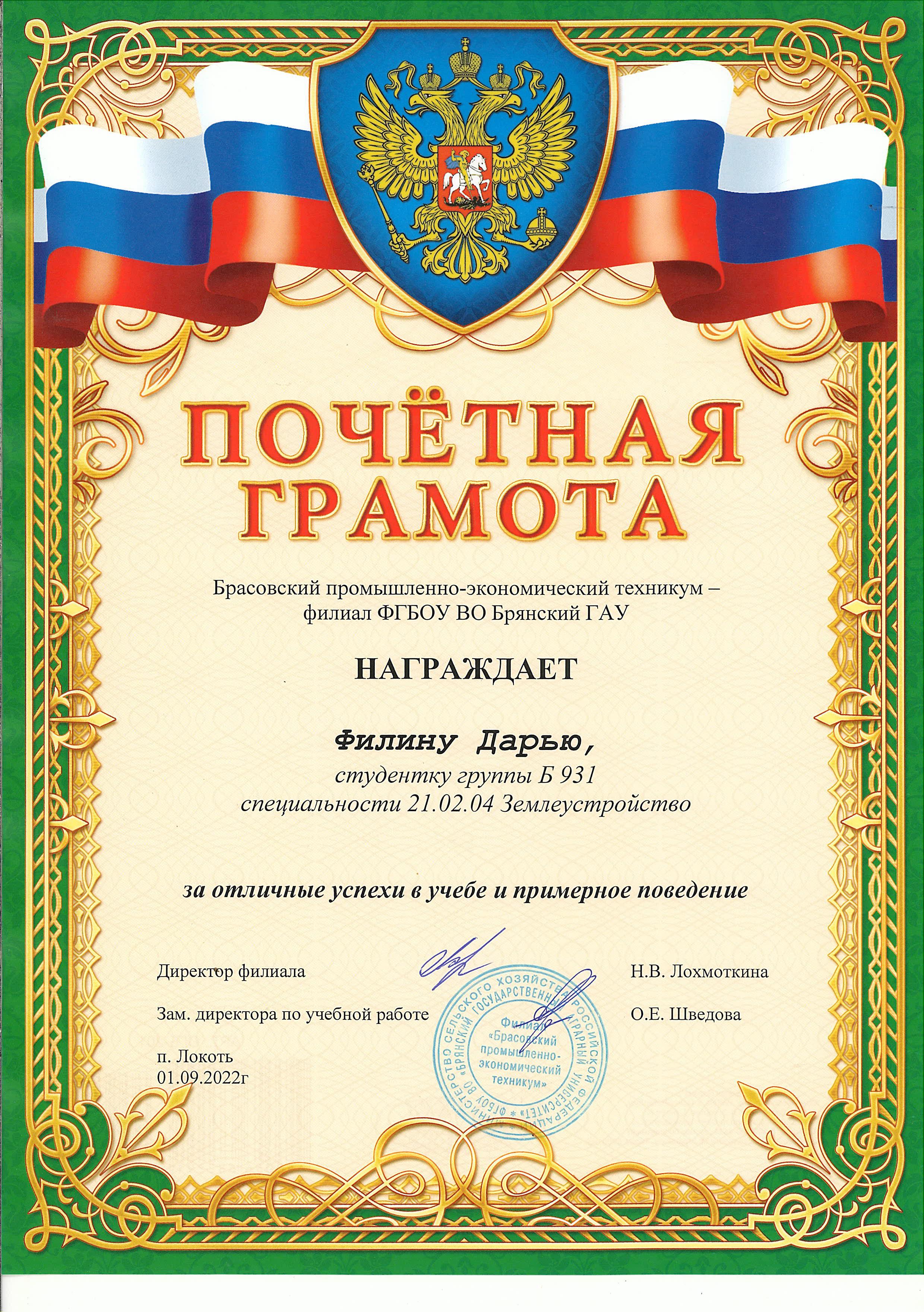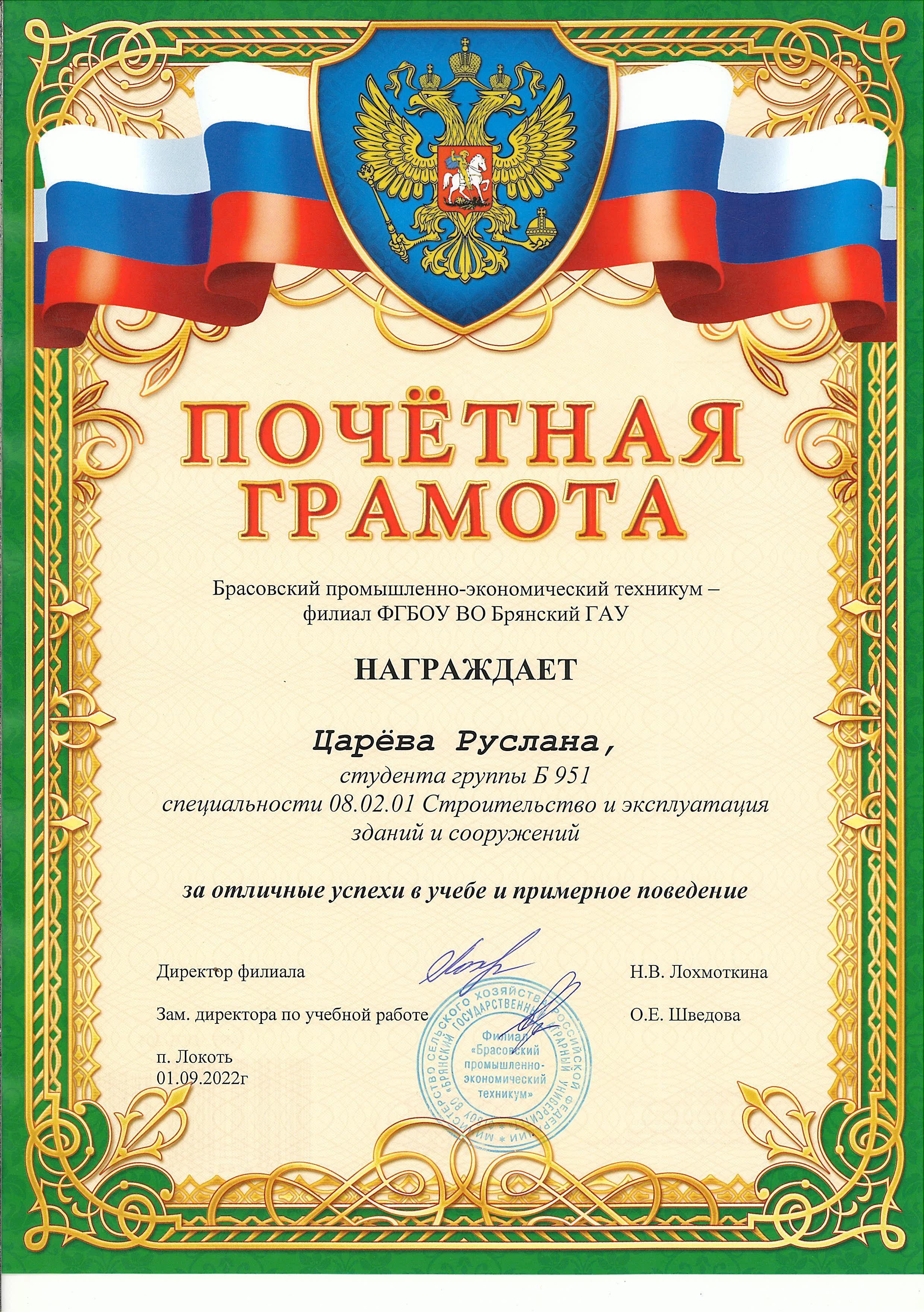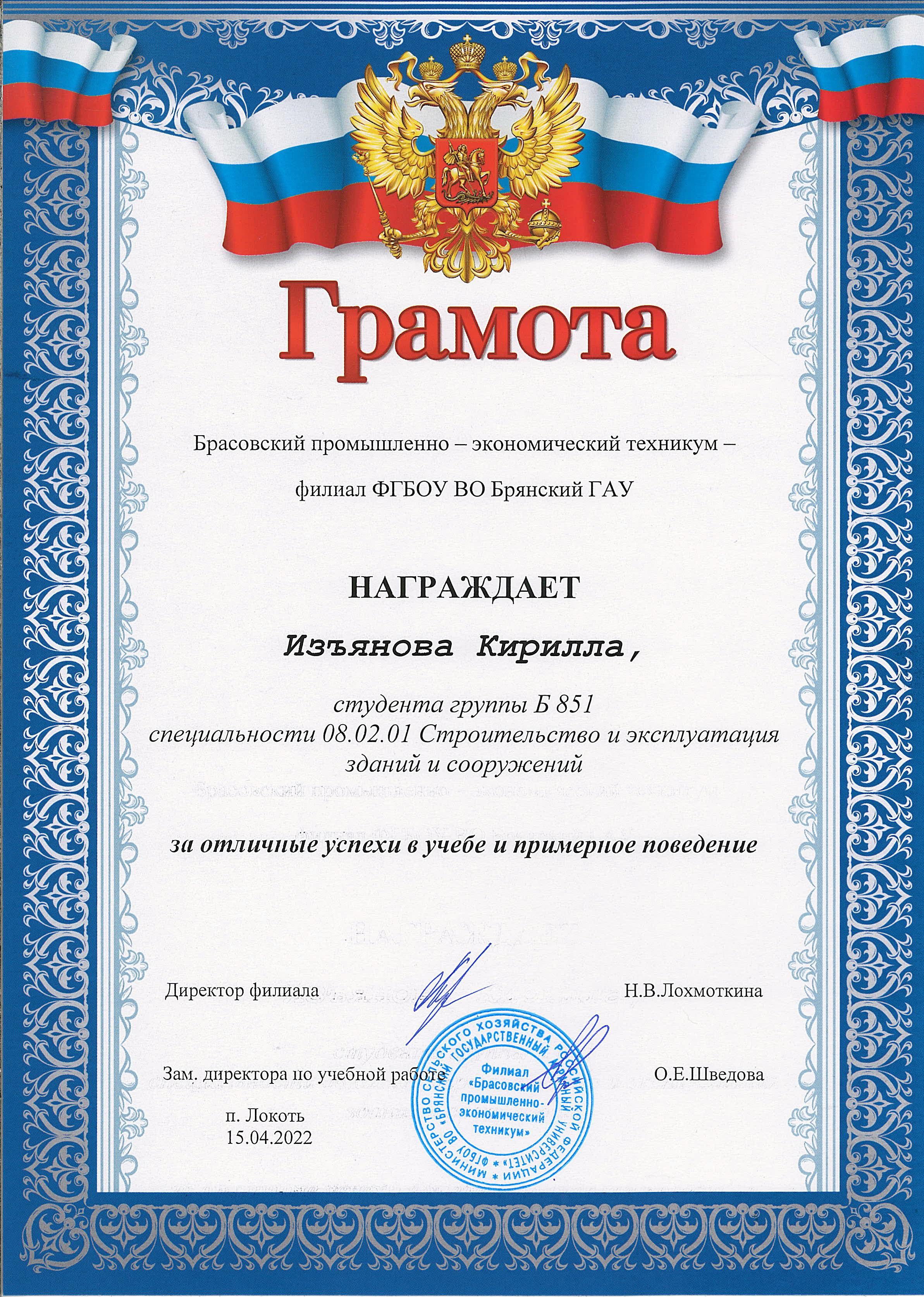 ЗА ОТЛИЧНЫЕ УСПЕХИ В УЧЕБЕ И ПРИМЕРНОЕ ПОВЕДЕНИЕ