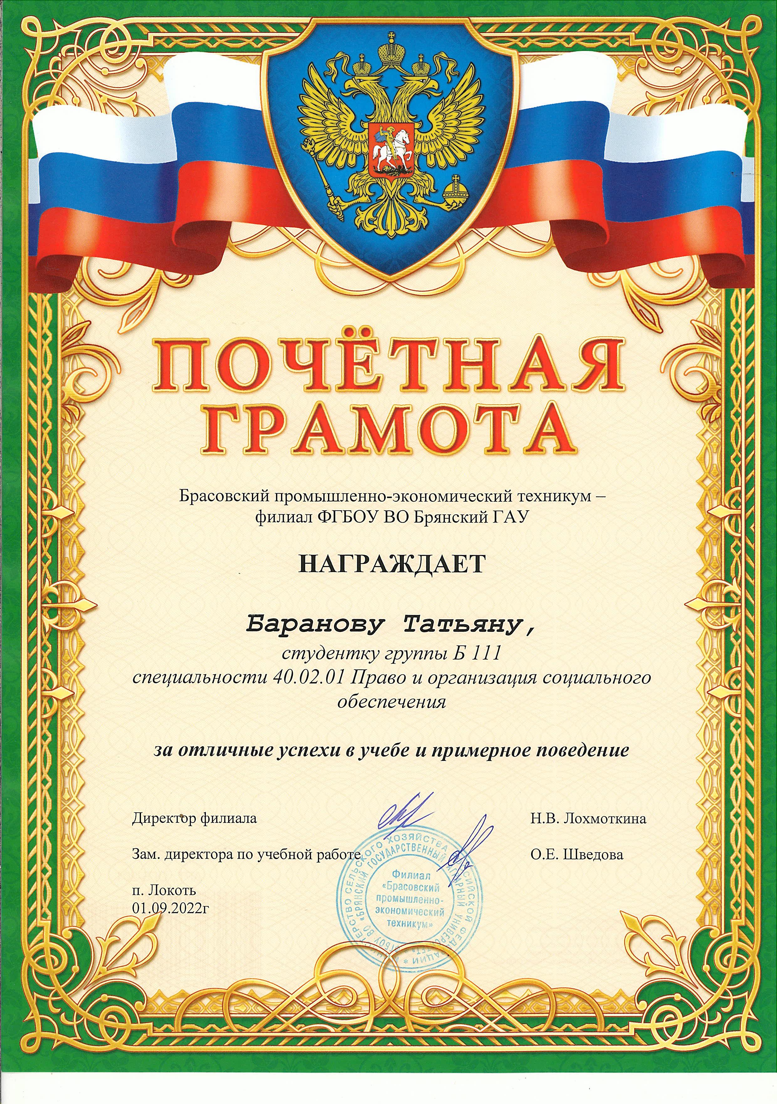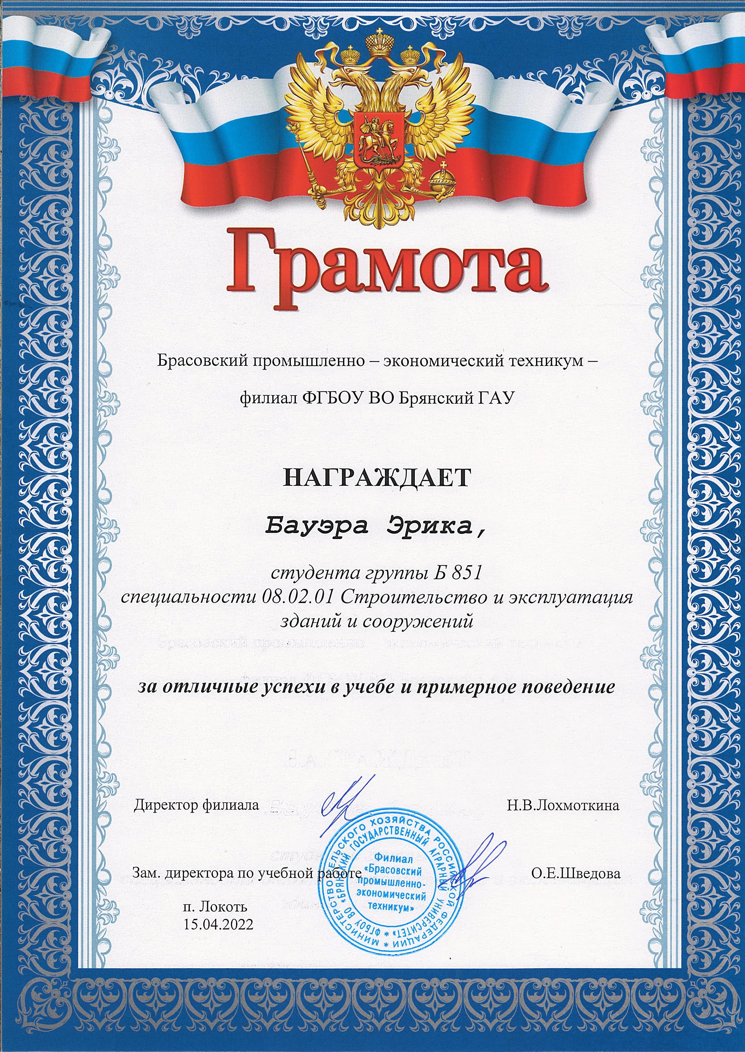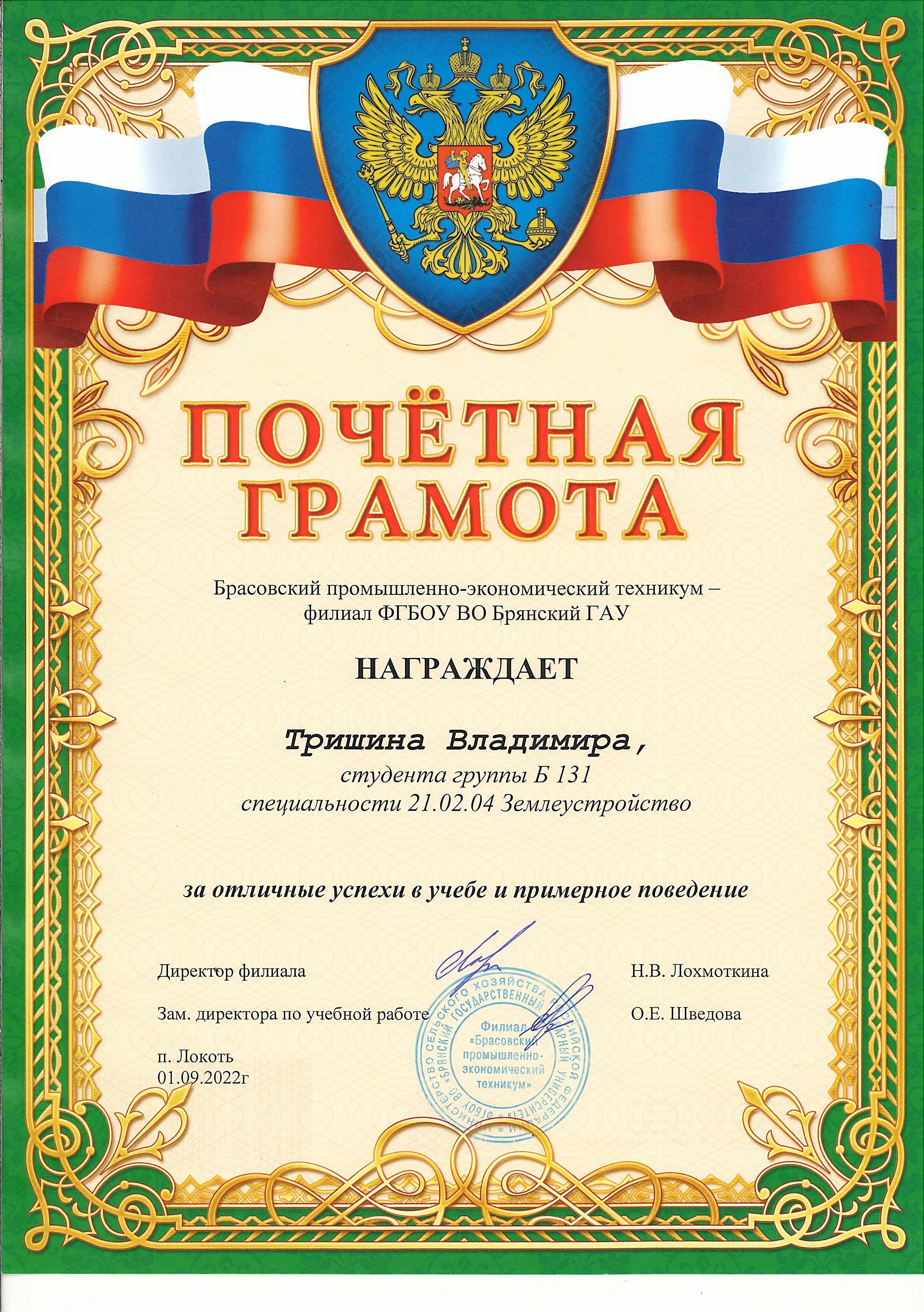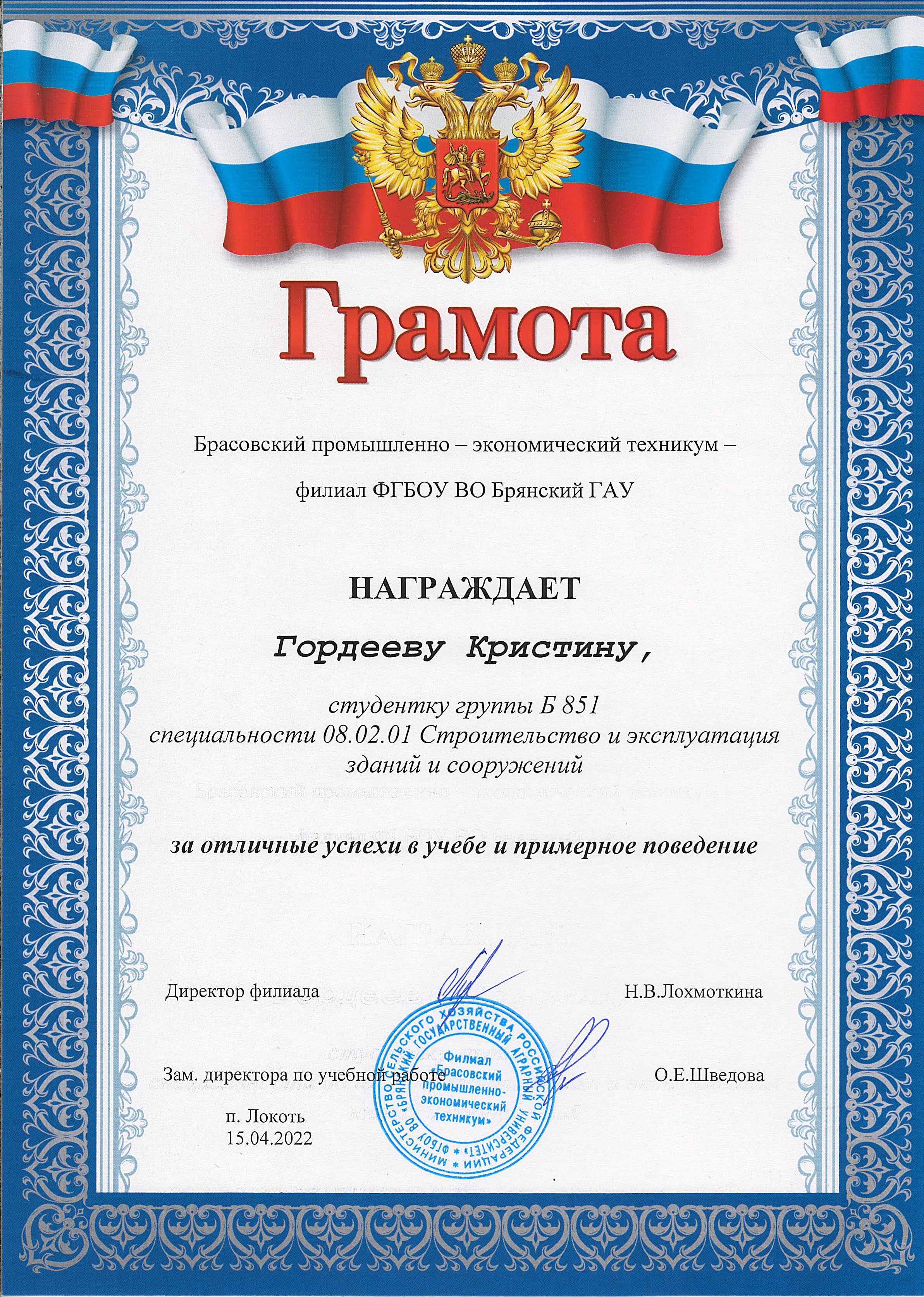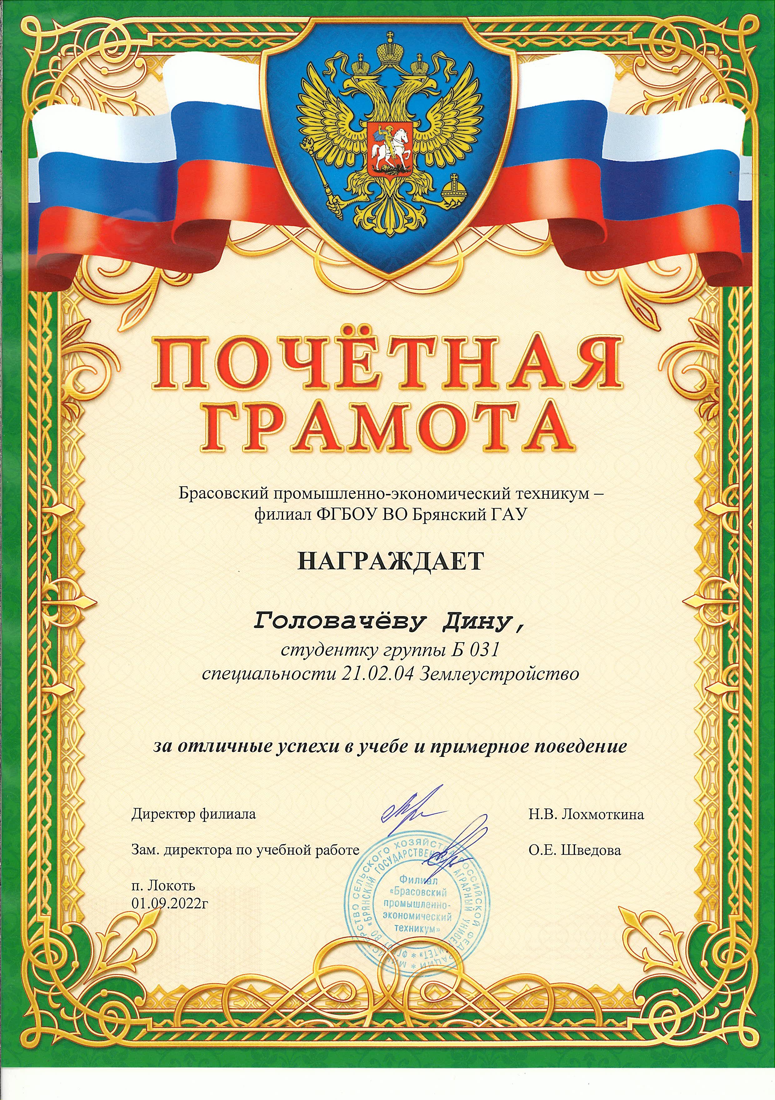 ЗА ОТЛИЧНЫЕ УСПЕХИ В УЧЕБЕ И ПРИМЕРНОЕ ПОВЕДЕНИЕ
