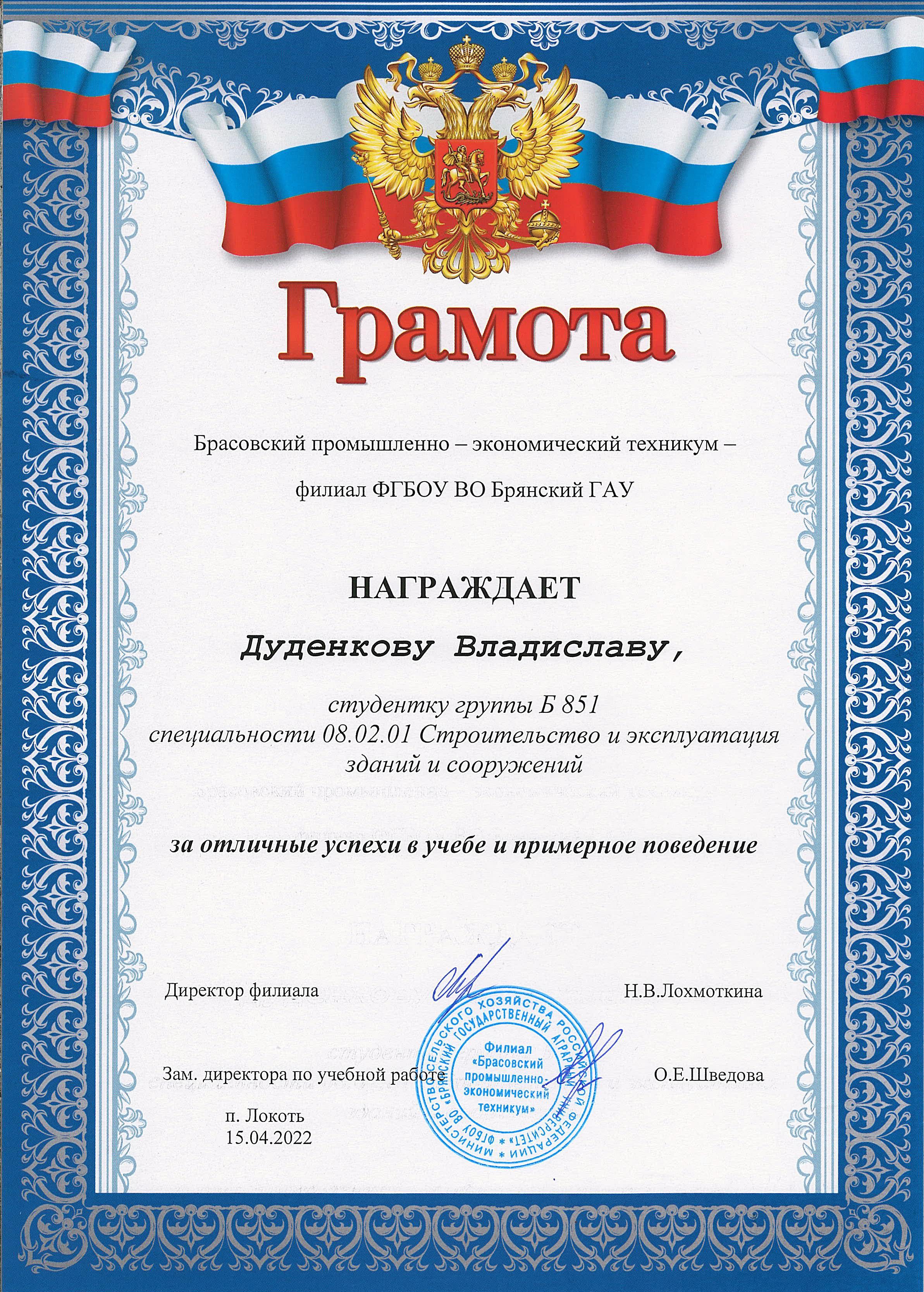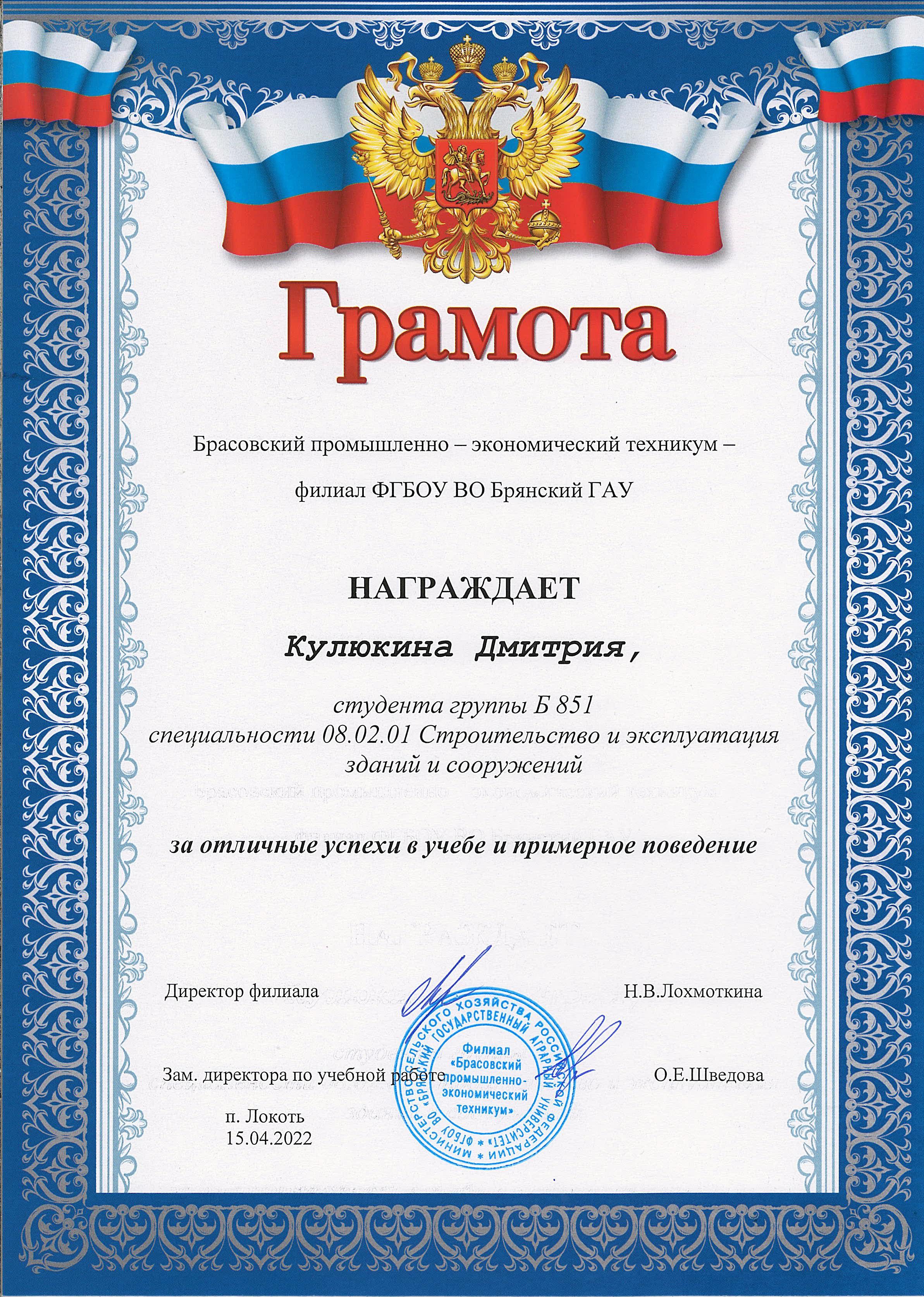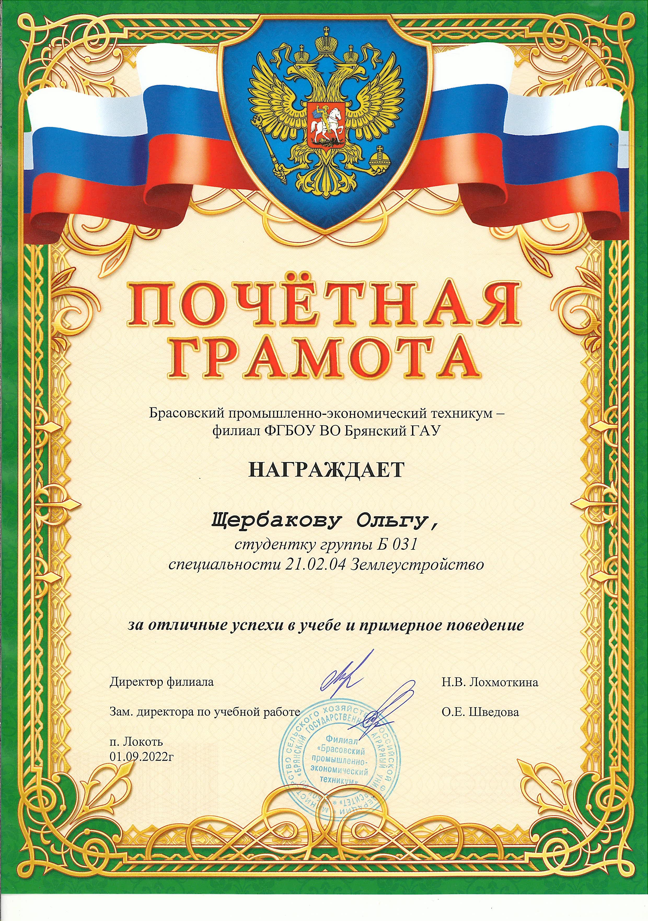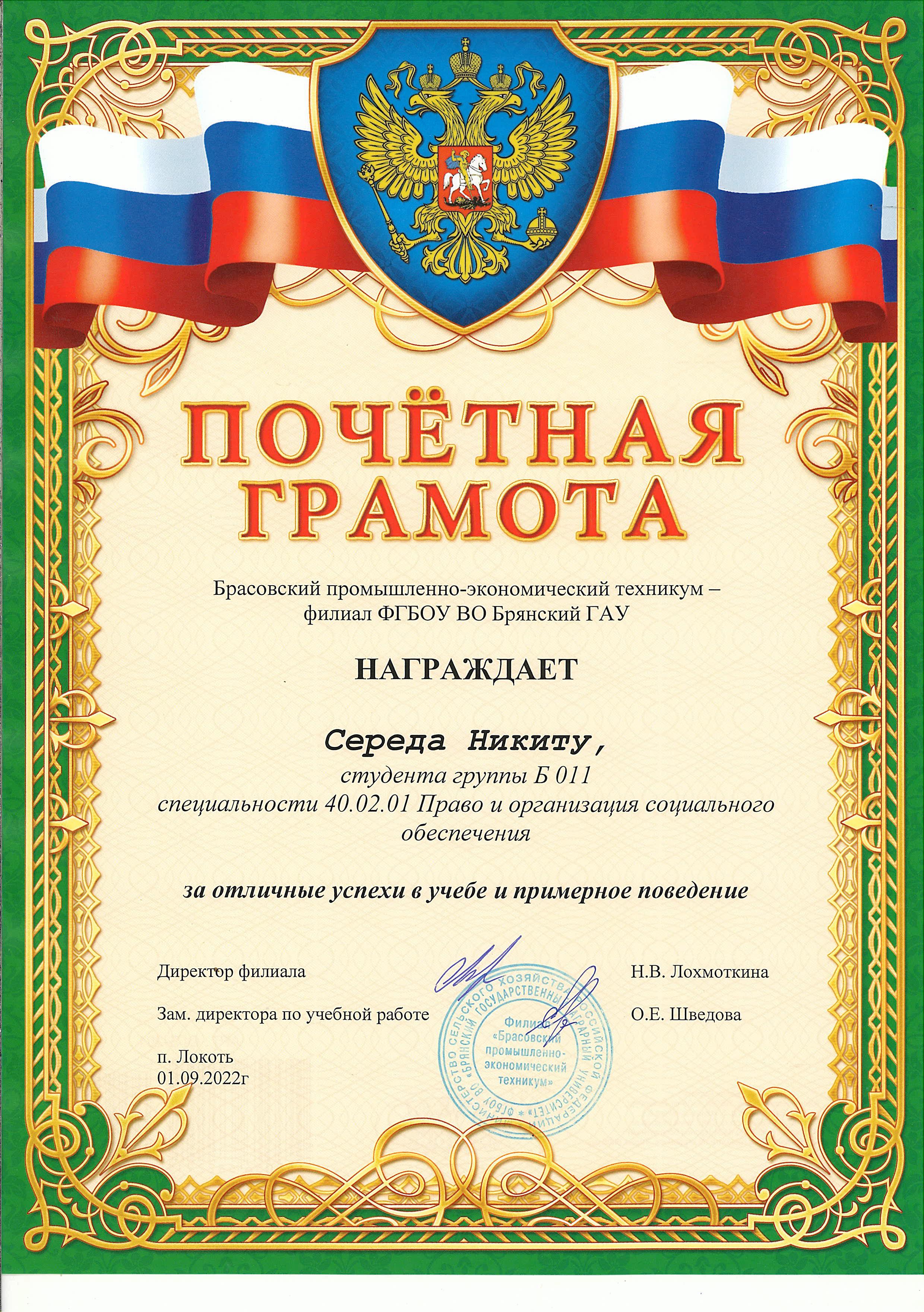 ЗА ОТЛИЧНЫЕ УСПЕХИ В УЧЕБЕ И ПРИМЕРНОЕ ПОВЕДЕНИЕ