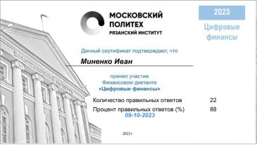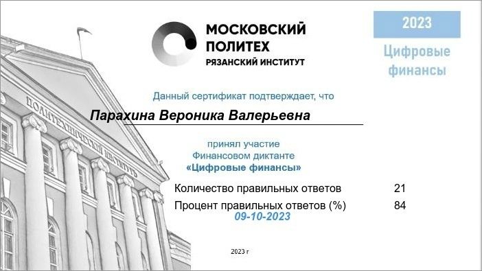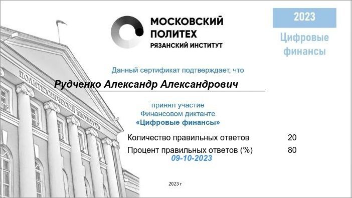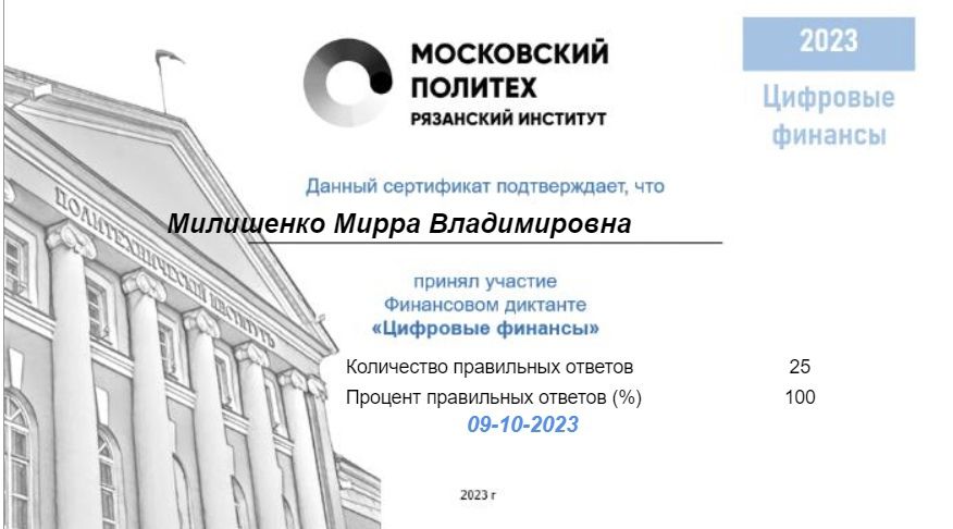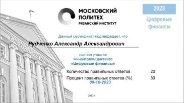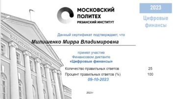 9 октября студенты Новозыбковского филиала приняли участие в Финансовом диктанте «Цифровые Финансы», целью которого является формирование рационального финансового поведения, финансовой культуры и повышение уровня финансовой грамотности. Все участники диктанта получили сертификаты.
