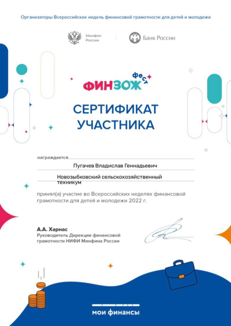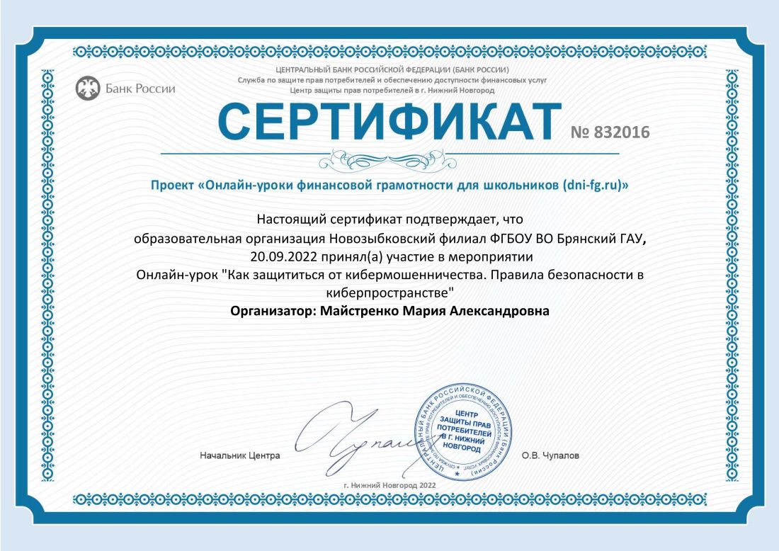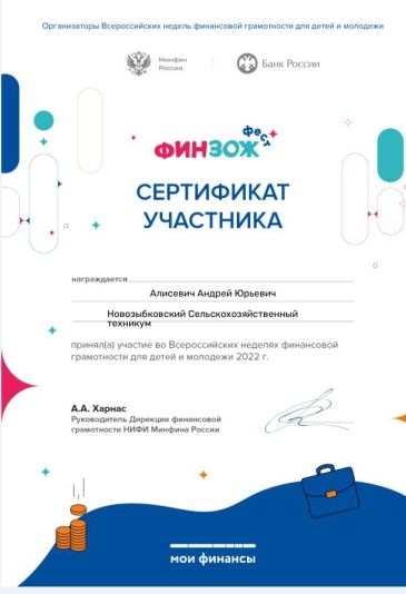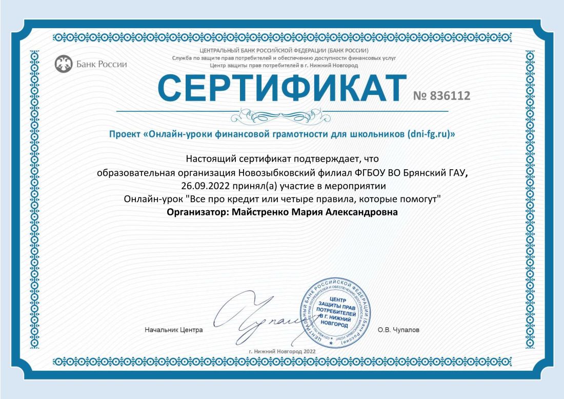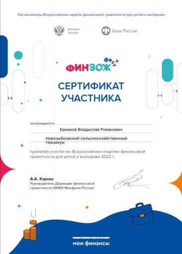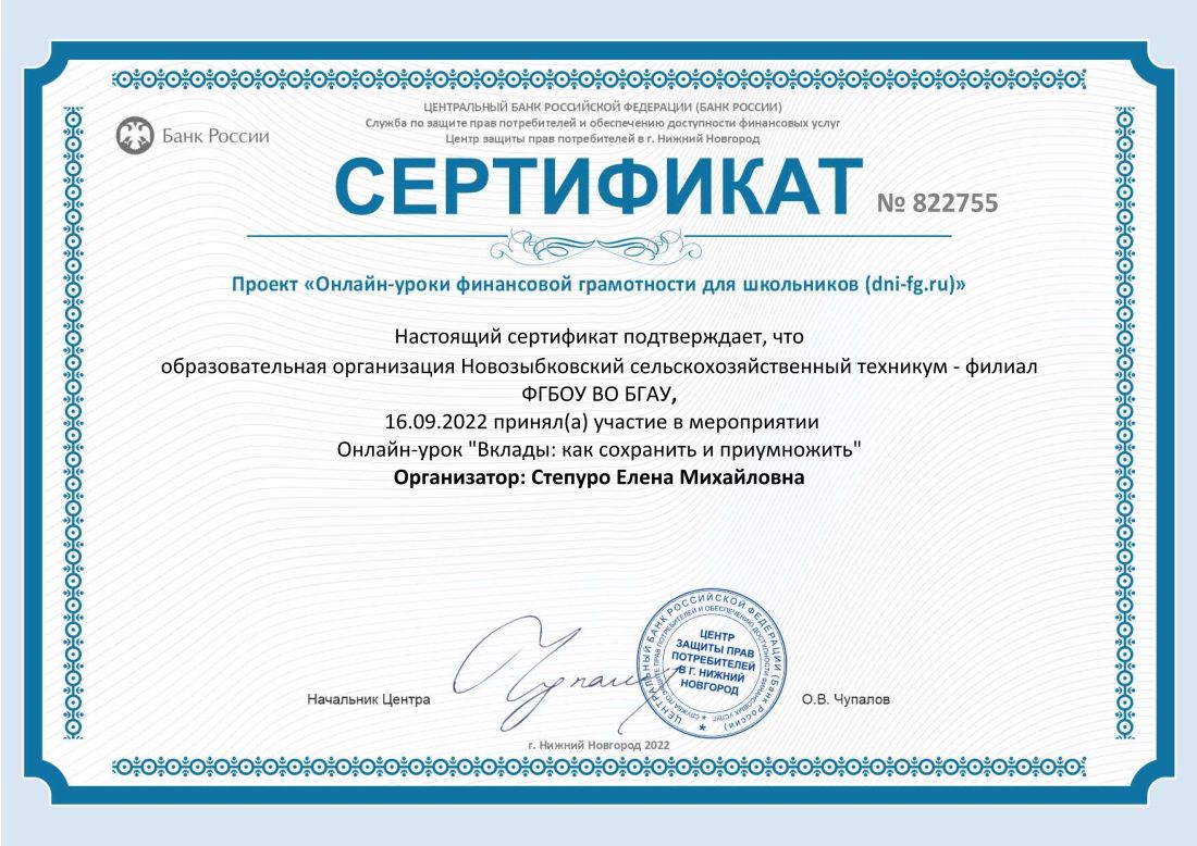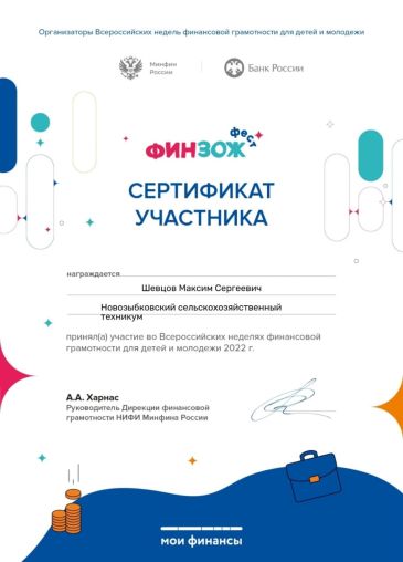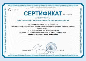 28 ноября 2022 года в Новозыбковском филиале ФГБОУ ВО Брянский ГАУ состоялся урок по финансовой грамотности, приуроченный к Всероссийской Неделе сбережений, проводимой Научно-исследовательским финансовым институтом Министерства финансов Российской Федерации в рамках реализации Стратегии повышения финансовой грамотности населения в Российской Федерации на 2017-2023 годы. Мероприятие организовано и проведено преподавателем Майстренко М.А.