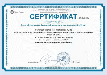 20 сентября студенты Новозыбковского филиала приняли участие в онлайн-уроке по финансовой грамотности на тему «С налогами на «Ты». Уроки в формате "один лектор – много участников" проходят в рамках осенней сессии онлайн-уроков, которая стартовала 14 сентября 2022г. и организована Центральным банком Российской Федерации. На уроке специалисты Федеральной налоговой службы РФ рассказали о том, кто и за что должен платить налоги, определили виды имущественных налогов, категории граждан, освобожденные от уплаты налогов, порядок расчета налогов. Ребята узнали об электронных сервисах федеральной налоговой системы, об ответственности за неуплату налогов.