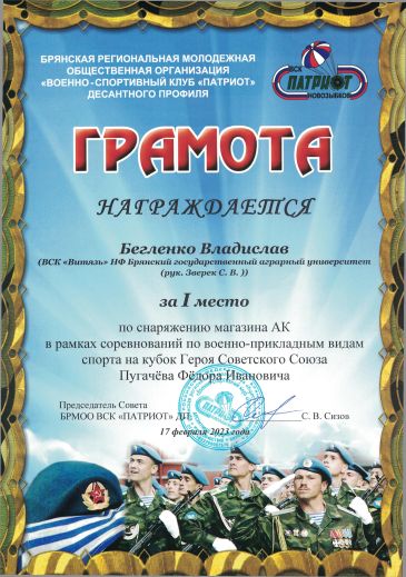 - Бегленко Владислав занял 1 место в соревновании по снаряжению магазина;