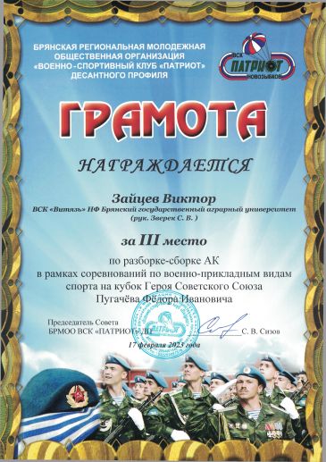 - Зайцев Виктор занял 3 место в соревновании по разборке – сборке автомата Калашникова.