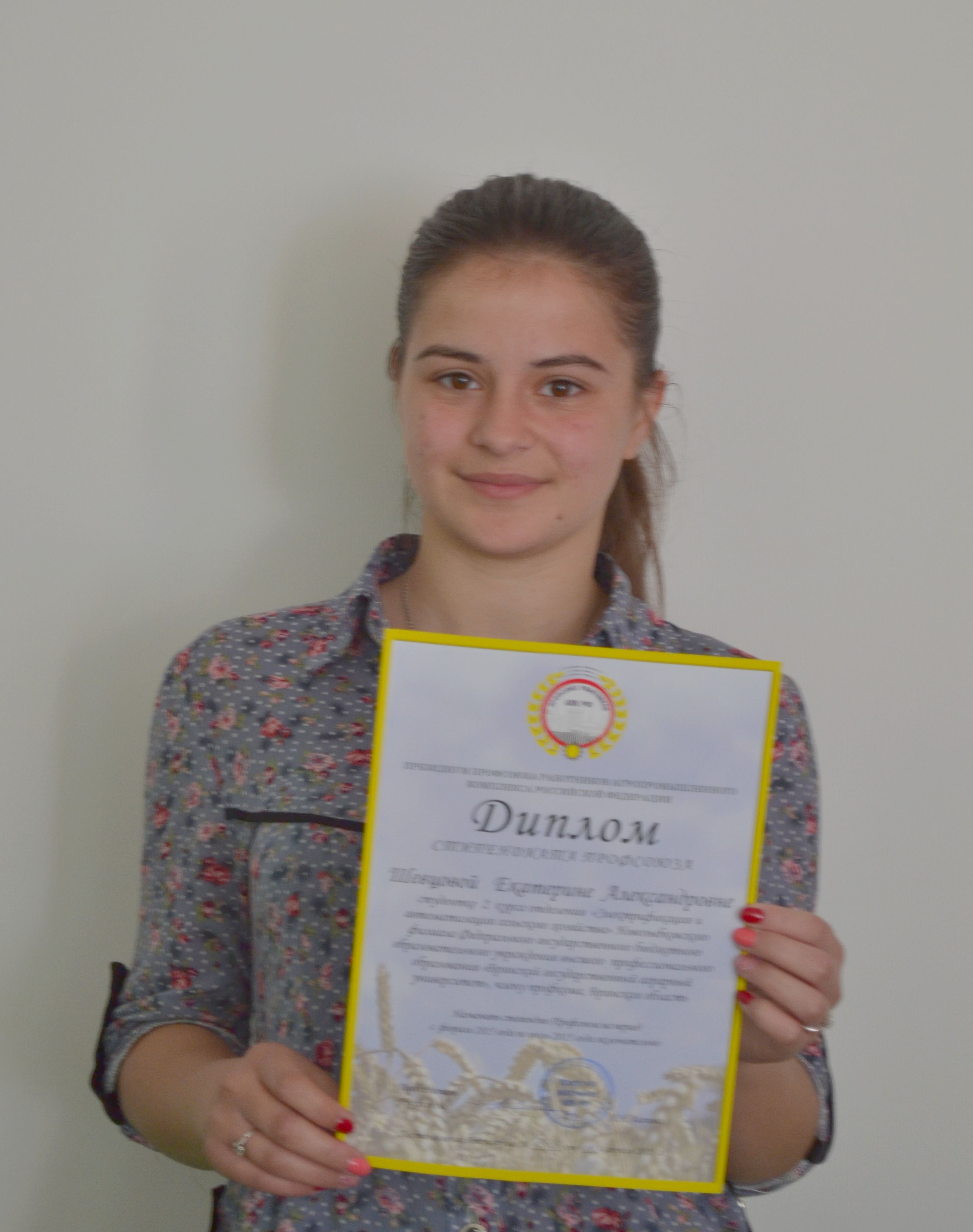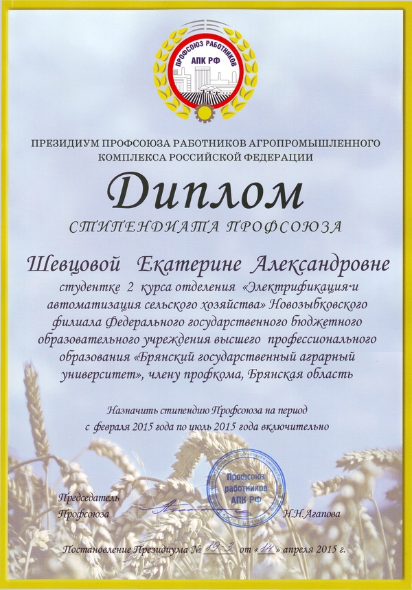 Диплом на получение именной стипендии Центрального комитета профсоюза работников агропромышленного комплекса и денежное подкрепление в размере 5400 рублей вручены студентке Новозыбковского филиала Брянского ГАУ Шевцовой Екатерине.