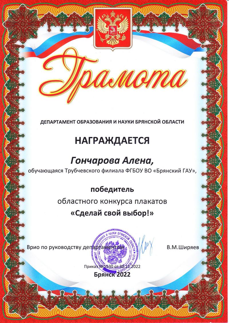 В октябре-ноябре 2022 г. в Брянске проводился конкурс плакатов «Сделай свой выбор!». Студентка 1-го курса Трубчевского аграрного колледжа Гончарова Алёна стала победителем. Ответственный за воспитательную работу в колледже Лопаткин В.В. в торжественной обстановке, в актовом зале, в начале общеколледжного мероприятия поздравил обучающуюся, вручил грамоту и призы (беспроводные наушники и портативное зарядное устройство).
