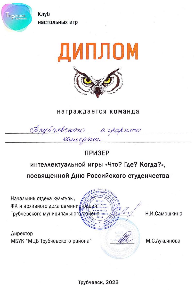 25.01.2023 г. в Клубе настольных игр «Территория развития» Трубчевской центральной районной библиотеки была проведена Интеллектуальная игра «Что? Где? Когда?», посвященная Дню Российского студенчества. Команда аграрного колледжа стала призером игры. За команду выступали обучающиеся 2-го курса специальности «Ветеринария»: Белеванцева Н., Васейкин А., Ельцова М., Трофимова П., Халимова З.В.