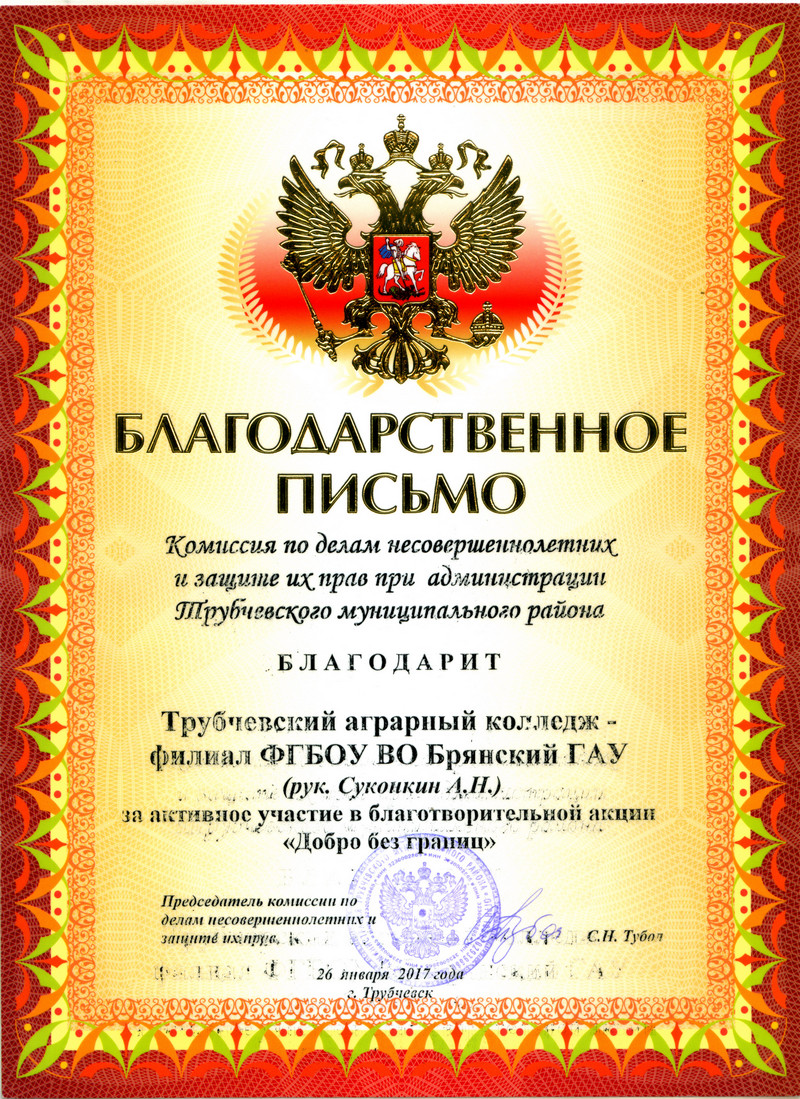 10.12.2016 – 15.01.2017 г.г. студенты Трубчевского аграрного колледжа приняли участие в акции «Добро без границ» для оказания благотворительной помощи несовершеннолетним, находящимся в центре социальной помощи семье и детям, а также проживающим в семьях, находящихся в социально опасном положении и трудной жизненной ситуации на территории Трубчевского муниципального района.