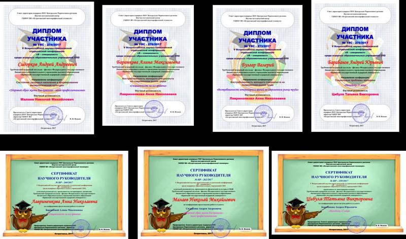 По итогам конференции студенты награждены Дипломами, их научные руководители Сертификатами. Поздравляем студентов: Баранкову А., Булгар В. – специальность Ветеринария, Барабанова А. – специальность Информационные системы (по отраслям), Сидоркова А. – специальность Кинология, с успешным выступлением на конференции. Благодарим Лавриненкову А.Н., Малаева Н.М., Цибуля Т.В. за руководство научно – исследовательской деятельностью студентов.