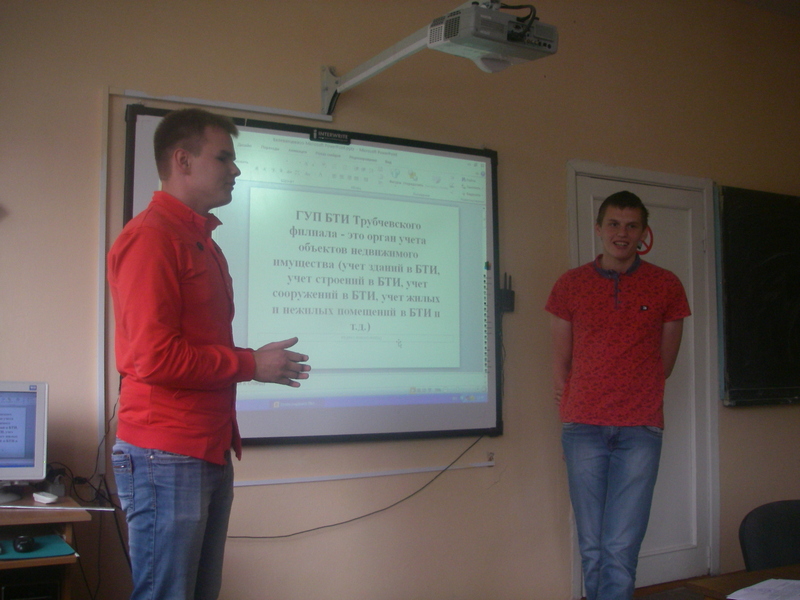 Студенты 3 курса поделились опытом прохождения преддипломной практики в профильных организациях Брянской области. Исаенкова рассказала о деятельности Муниципального отдела по Трубческому и Суземскому районам Управления Росреестра по Брянской области. Сисина остановилась на функциях Комитета по управлению муниципальным имуществом Погарского муниципального района. Лайкова представила свою деятельность на практике в Отделе по управлению муниципальным имуществом администрации Трубчевского муниципального района. Ганнусенко рассказала, как проходила ее практика в Бюро технической инвентаризации (БТИ) Трубчевский филиал. Студенты Частин, Белеванцев поделились опытом полевых работ, в Трубчевском филиале Брянскоблтехинвентаризация.