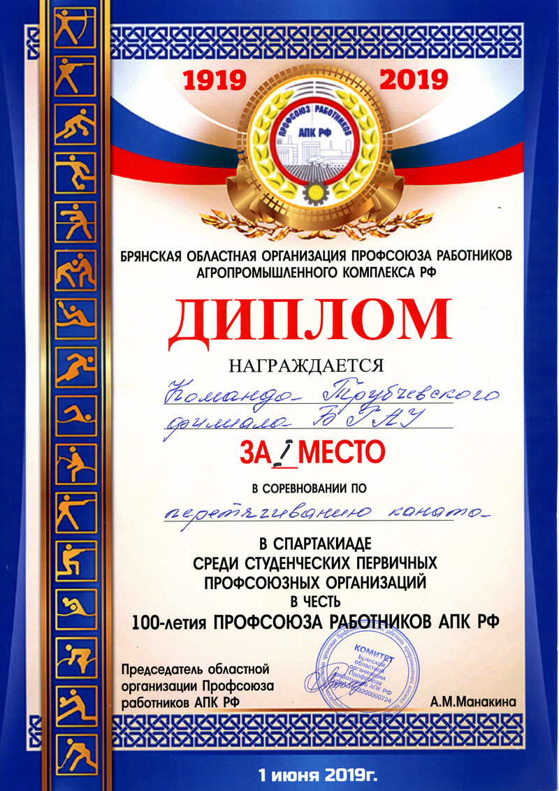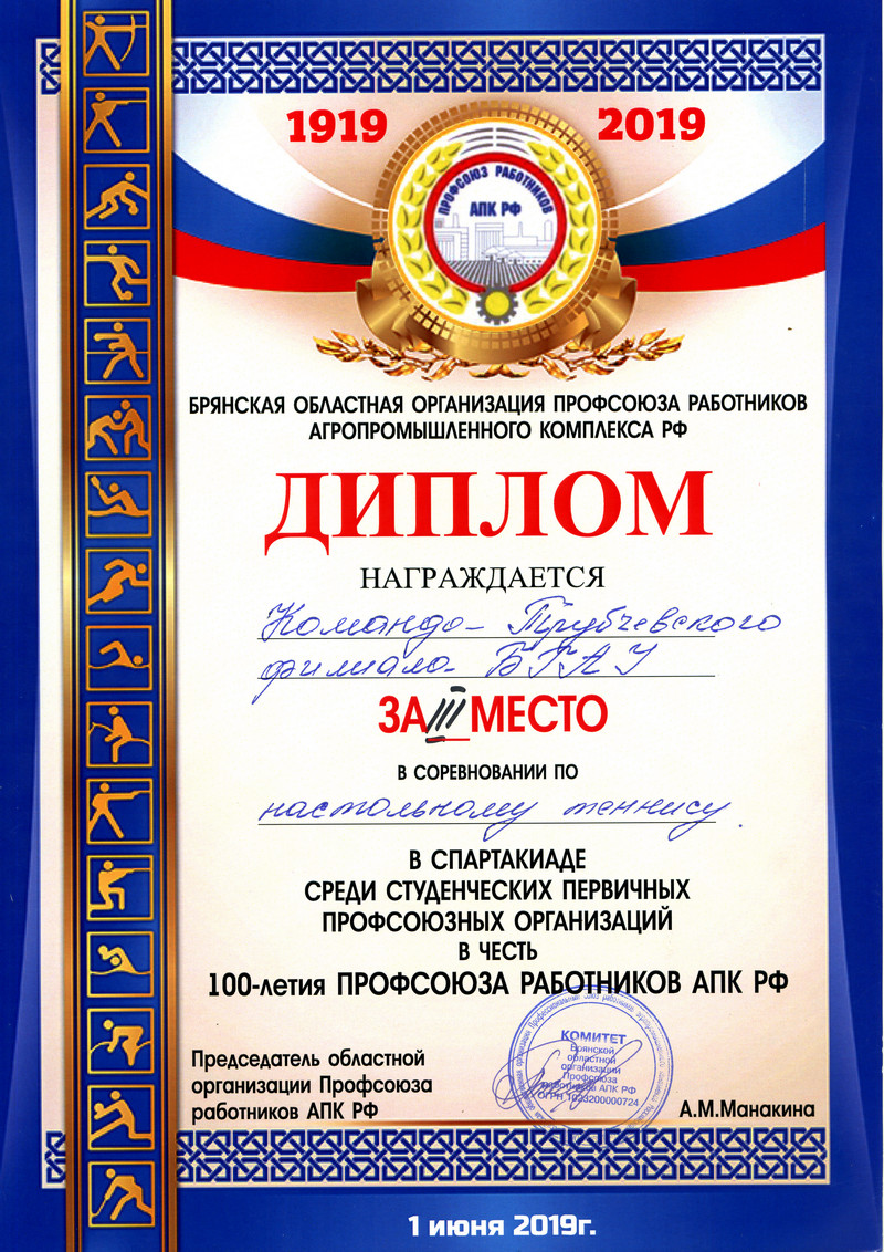 Дипломы за 1-3 места в спартакиаде 100-летия профсоюза работников АПК РФ