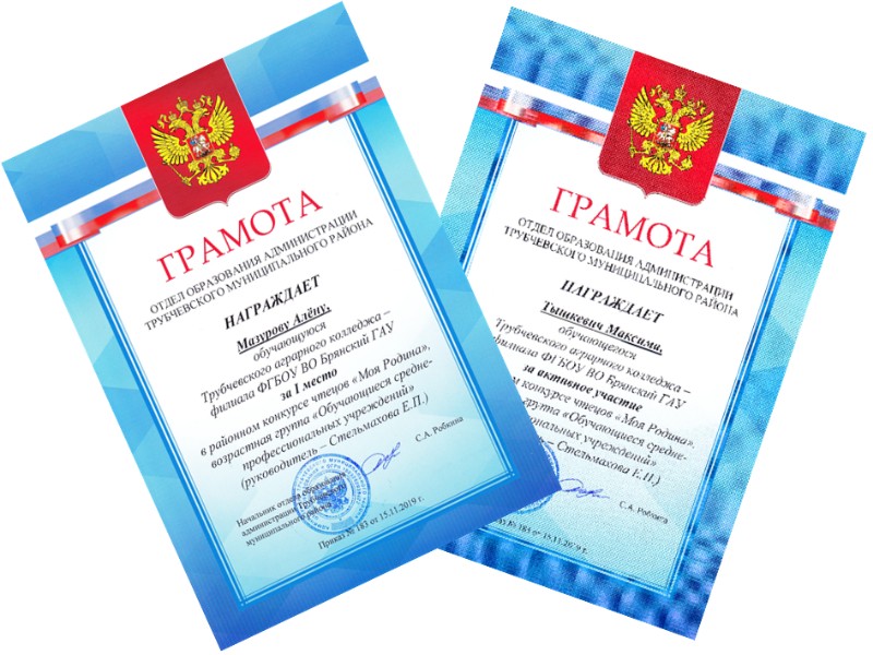 14 ноября 2019 г. в читальном зале Центральной районной библиотеки был проведен муниципальный этап регионального конкурса чтецов «Моя Родина», посвященного 75-й годовщине Победы в Великой Отечественной войне 1941-1945 г.г. В нем приняли участие обучающиеся 2 курса Трубчевского аграрного колледжа: Мазурова Алена заняла 1 место в конкурсе, Тышкевич Максим был награжден грамотой за активное участие.