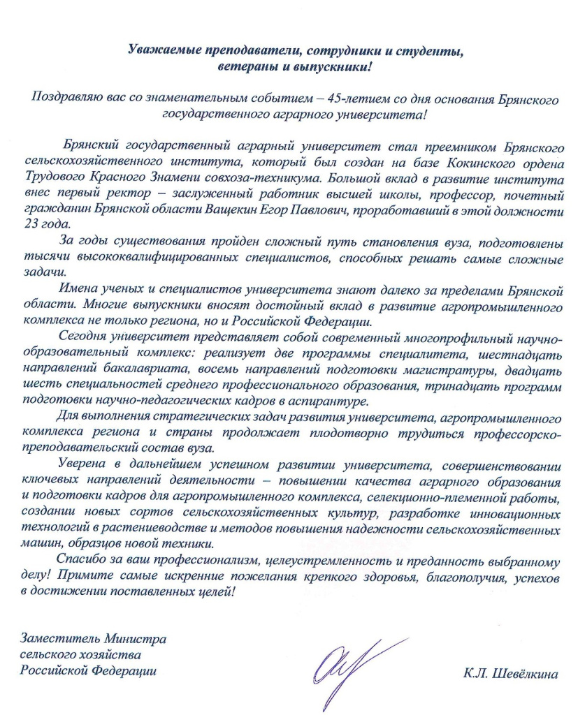 Приветствие Заместителя Министра сельского хозяйства Российской Федерации К.Л. Шевёлкиной федеральному государственному бюджетному образовательному учреждению высшего образования «Брянский государственный аграрный университет»