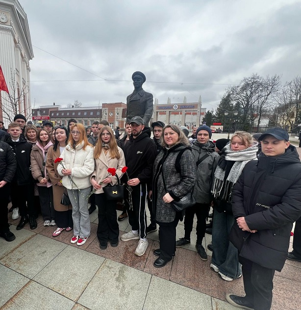 Вместе с В.М. Афанасьевым студенты и вся делегация Брянского ГАУ возложили цветы к памятнику Юрию Гагарину и сфотографировались с Героем Космоса.