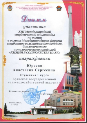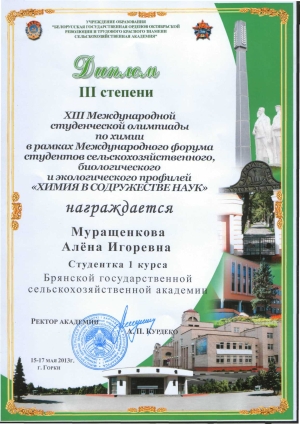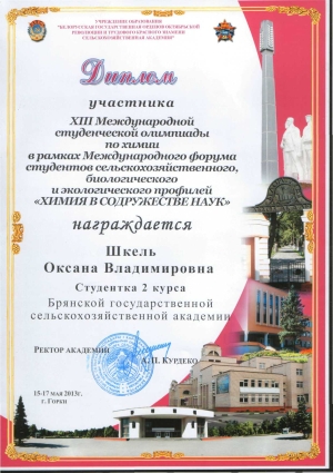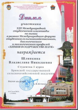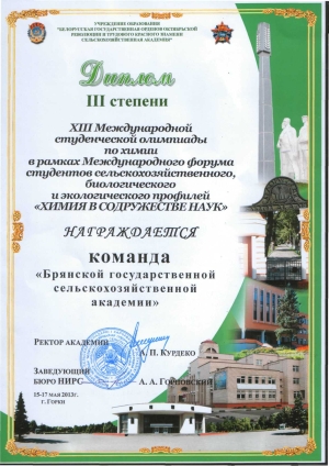 В г. Горки (Могилевская область, Республика Беларусь) прошла XIII международная студенческая олимпиада по химии в рамках Международного форума студентов сельскохозяйственного, биологического и экологического профилей. Среди команд десяти ВУЗов участников, команда Брянской ГСХА в составе: Муращенкова Алена (ФВМиБ), Шкель Оксана (ФВМиБ), Юреско Анастасия (ФВМиБ), Шляпкина Владислава (ФВМиБ) заняла 3-е место. Муращенкова Алена заняла 3-е место в личном первенстве. Руководители команды: доцент, зав. кафедрой химии, биотехнологии и физиологии растений Е.В. Мартынова, доцент Г.В. Чекин.