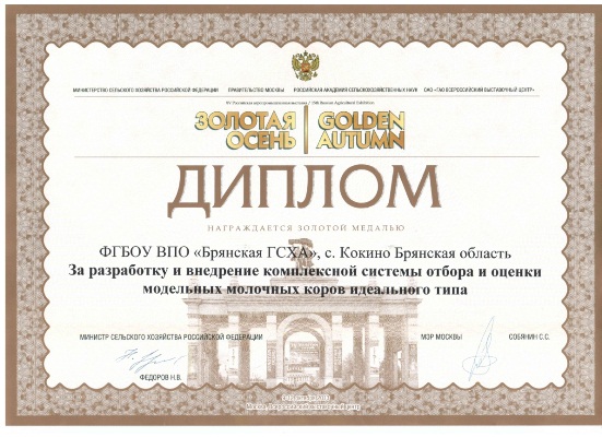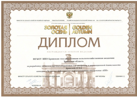 Коллективом ведущих ученых всех факультетов и Агроэкологического института академии завоевана Золотая медаль «За разработку каталога научных разработок для внедрения и инновационной деятельности Брянской ГСХА» в номинации «За высокоэффективное информационное обеспечение АПК».