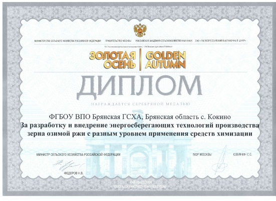 Серебряная медаль завоевана временным творческим коллективом ученых, возглавляемым доктором с.-х. наук, профессором Николай Максимовичем Белоусом «За разработку и внедрение энергосберегающих технологий производства зерна озимой ржи с разным уровнем применения средств химизации».