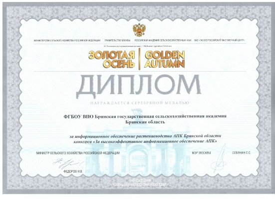 Серебряная медаль завоевана коллективом ученых под руководством доктора с.-х. наук, профессора Владимира Ефимовича Торикова «За информационное обеспечение растениеводства АПК Брянской области».
