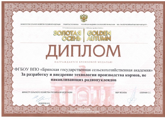 За участие выставки ФГБОУ ВПО «Брянская ГСХА» была отмечена дипломом Министерства сельского хозяйства, Правительства Москвы, Российской академией сельскохозяйственных наук и ВВЦ.